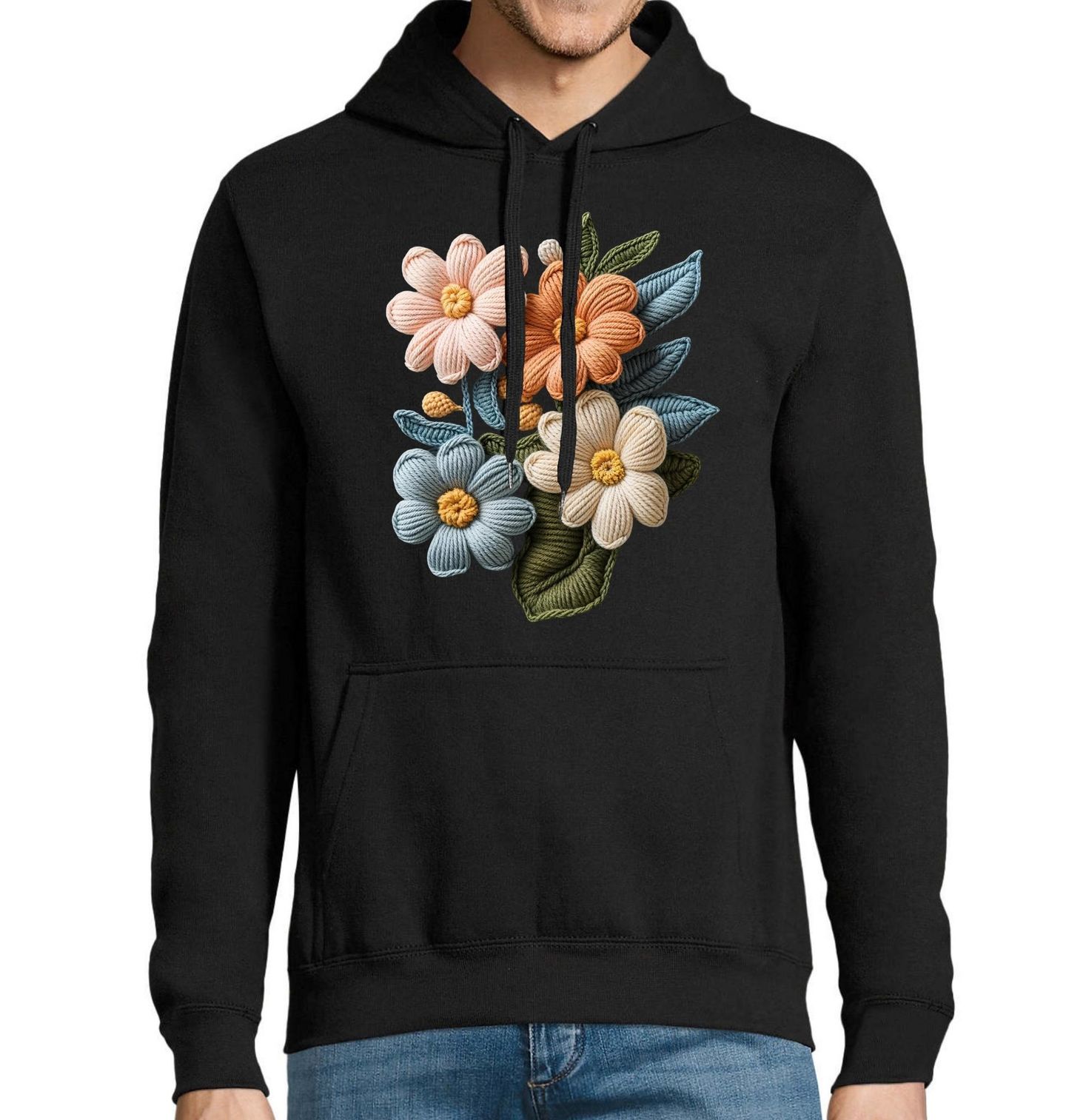 Pánská mikina Háčkované Luční Květiny. Motiv je vytištěný potiskem – nejedná se o výšivku ani háčkovaný 3D prvek! Jemný motiv, kde dominují květiny ve stylu háčkované příze, působí hřejivě, romanticky a zároveň moderně. Pokud miluješ květiny a ručně tvořený vzhled, tento motiv ti přinese pocit útulnosti a originality do každodenního outfitu.