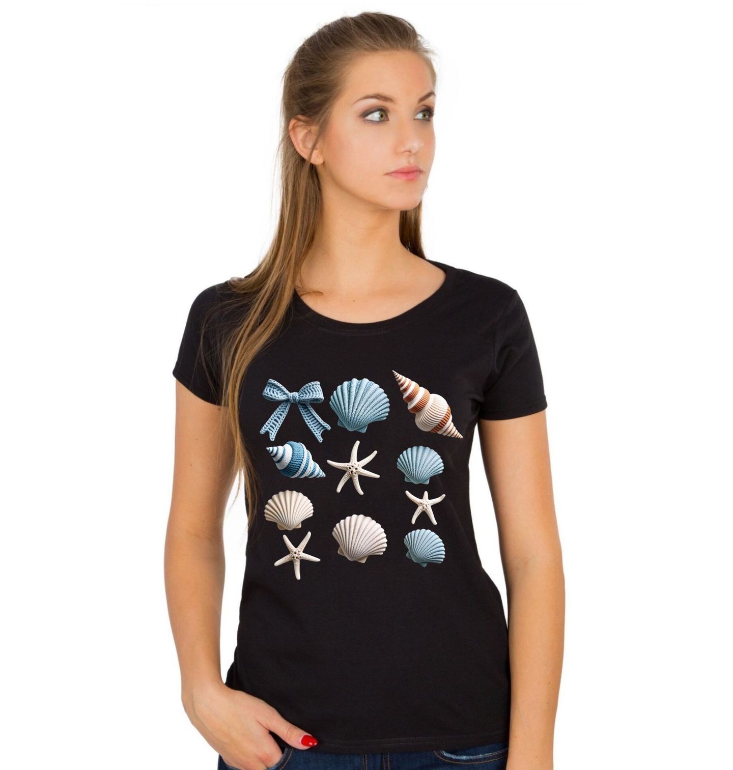 Dámské tričko Háčkované Mušle. Motiv je vytištěný potiskem – nejedná se o výšivku ani háčkovaný 3D prvek! Design je laděný do pastelových tónů a připomíná poklady nalezené na pláži – hvězdice, lastury i dekorativní mašle. Pokud hledáš motiv, který propojuje klidné moře a detailní ilustraci, tahle mušle je ideální volbou pro všechny, kdo milují lehkost a prázdninovou náladu.