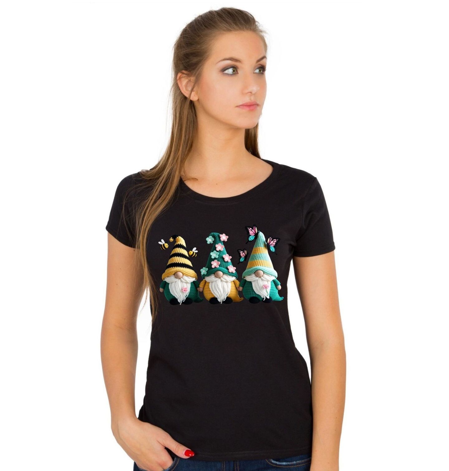 Dámské tričko Háčkovaní Skřítci. Motiv je vytištěný potiskem – nejedná se o výšivku ani háčkovaný 3D prvek! Hravý jarní motiv, kde hlavní roli hrají skřítci obklopení přírodou, přináší veselou atmosféru plnou barev a fantazie. Detailně zpracované květiny, jemný motýl i malá včela vytvářejí kouzelnou scénu, která zaujme na první pohled.