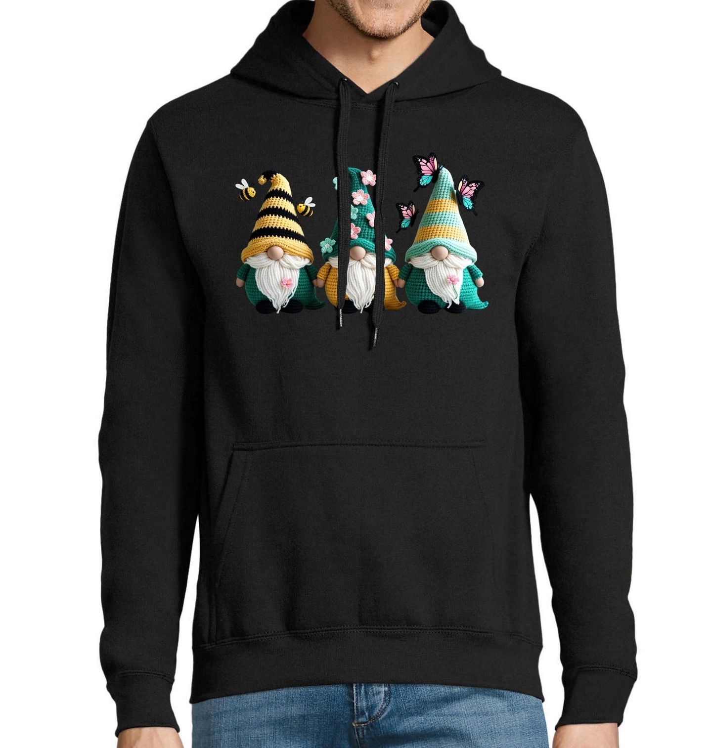 Pánská mikina Háčkovaní Skřítci. Motiv je vytištěný potiskem – nejedná se o výšivku ani háčkovaný 3D prvek! Hravý jarní motiv, kde hlavní roli hrají skřítci obklopení přírodou, přináší veselou atmosféru plnou barev a fantazie. Detailně zpracované květiny, jemný motýl i malá včela vytvářejí kouzelnou scénu, která zaujme na první pohled.