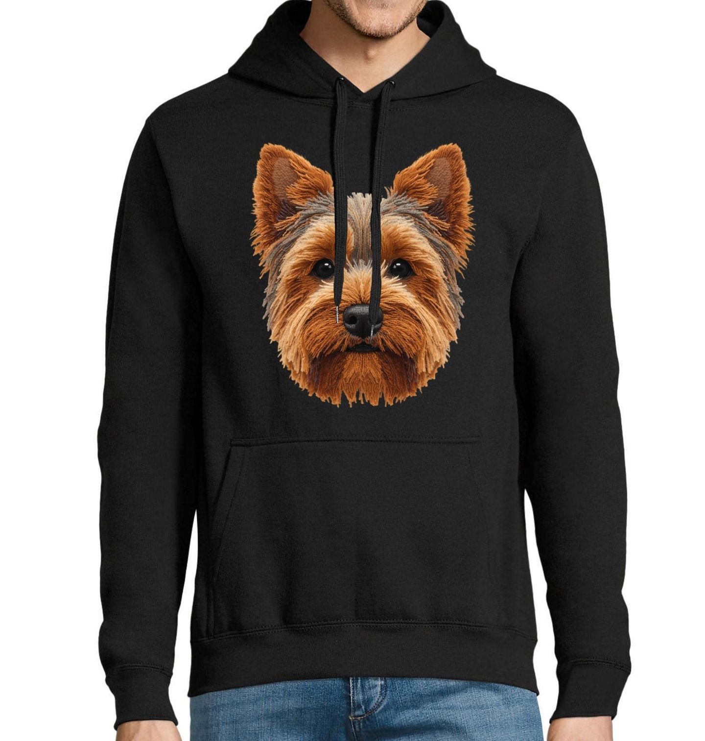 Pánská mikina Háčkovaný Jorkšírský teriér. Motiv je vytištěný potiskem – nejedná se o výšivku ani háčkovaný 3D prvek! Jemný styl připomínající ruční háčkování dodává designu útulnou atmosféru a zvýrazňuje typický roztomilý vzhled tohoto oblíbeného plemene. Tento motiv je ideální pro každého, kdo je hrdý pejskař a chce svou lásku ke psům ukázat originálním způsobem.