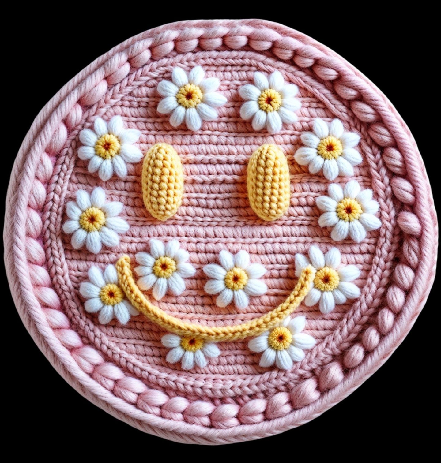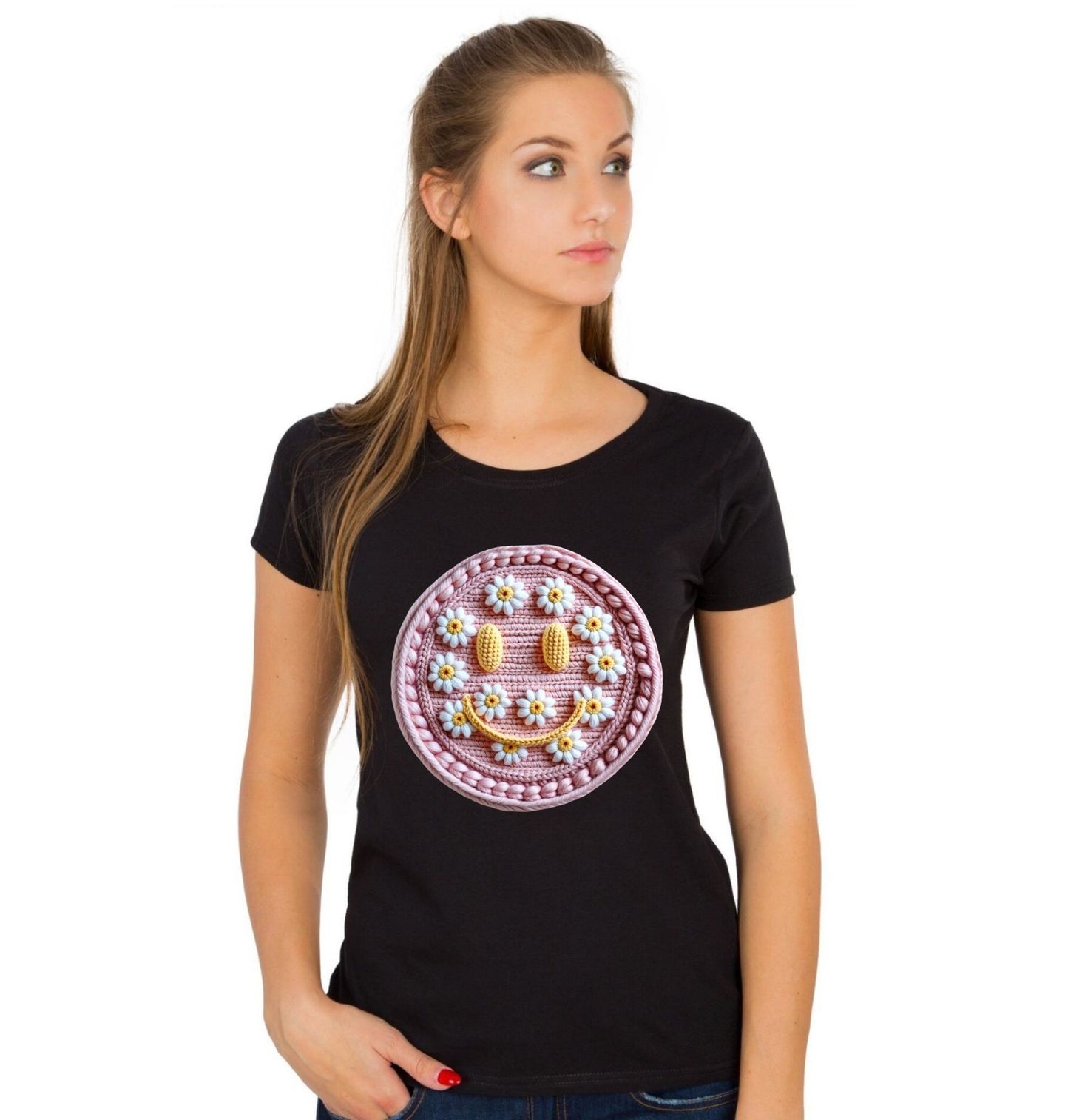 Dámské tričko Háčkovaný Květinový Smajlík. Motiv je vytištěný potiskem – nejedná se o výšivku ani háčkovaný 3D prvek! Originální motiv, kde se propojuje hravé emoji a něžné květiny v jemných pastelových barvách. Design působí pozitivně a uklidňujícím dojmem, takže je ideální pro každodenní nošení i jako milý dárek pro všechny, kdo milují veselý styl a květinové detaily.