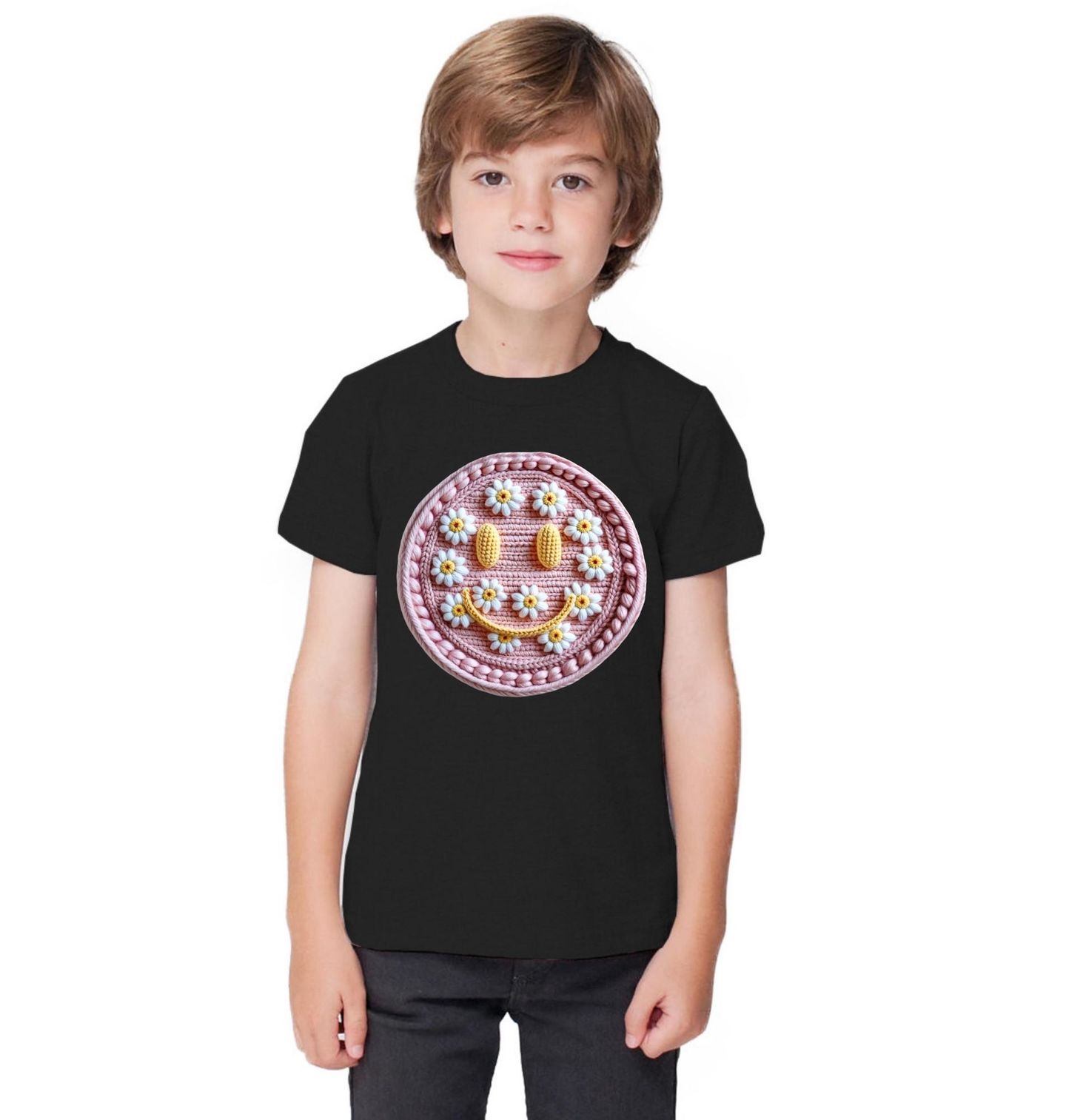 Dětské tričko Háčkovaný Květinový Smajlík. Motiv je vytištěný potiskem – nejedná se o výšivku ani háčkovaný 3D prvek! Originální motiv, kde se propojuje hravé emoji a něžné květiny v jemných pastelových barvách. Design působí pozitivně a uklidňujícím dojmem, takže je ideální pro každodenní nošení i jako milý dárek pro všechny, kdo milují veselý styl a květinové detaily.