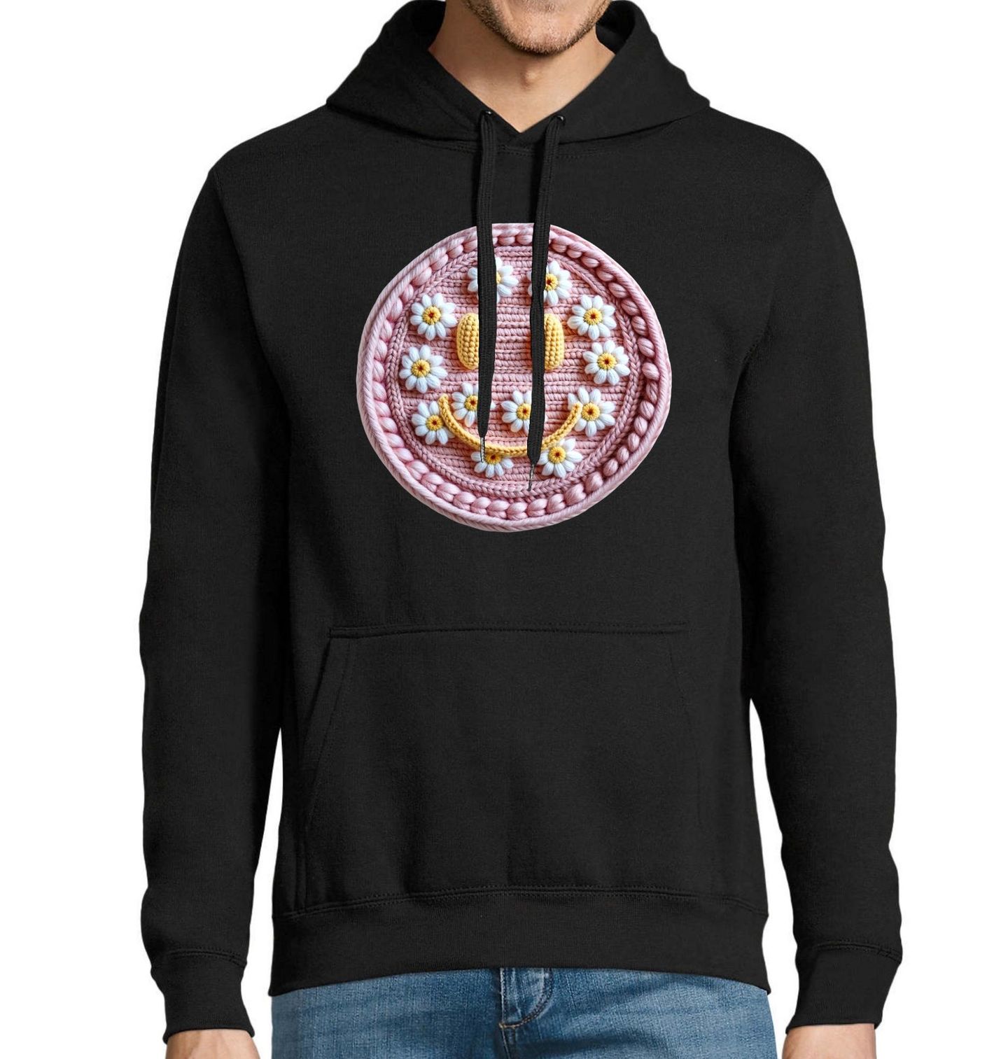 Pánská mikina Háčkovaný Květinový Smajlík. Motiv je vytištěný potiskem – nejedná se o výšivku ani háčkovaný 3D prvek! Originální motiv, kde se propojuje hravé emoji a něžné květiny v jemných pastelových barvách. Design působí pozitivně a uklidňujícím dojmem, takže je ideální pro každodenní nošení i jako milý dárek pro všechny, kdo milují veselý styl a květinové detaily.