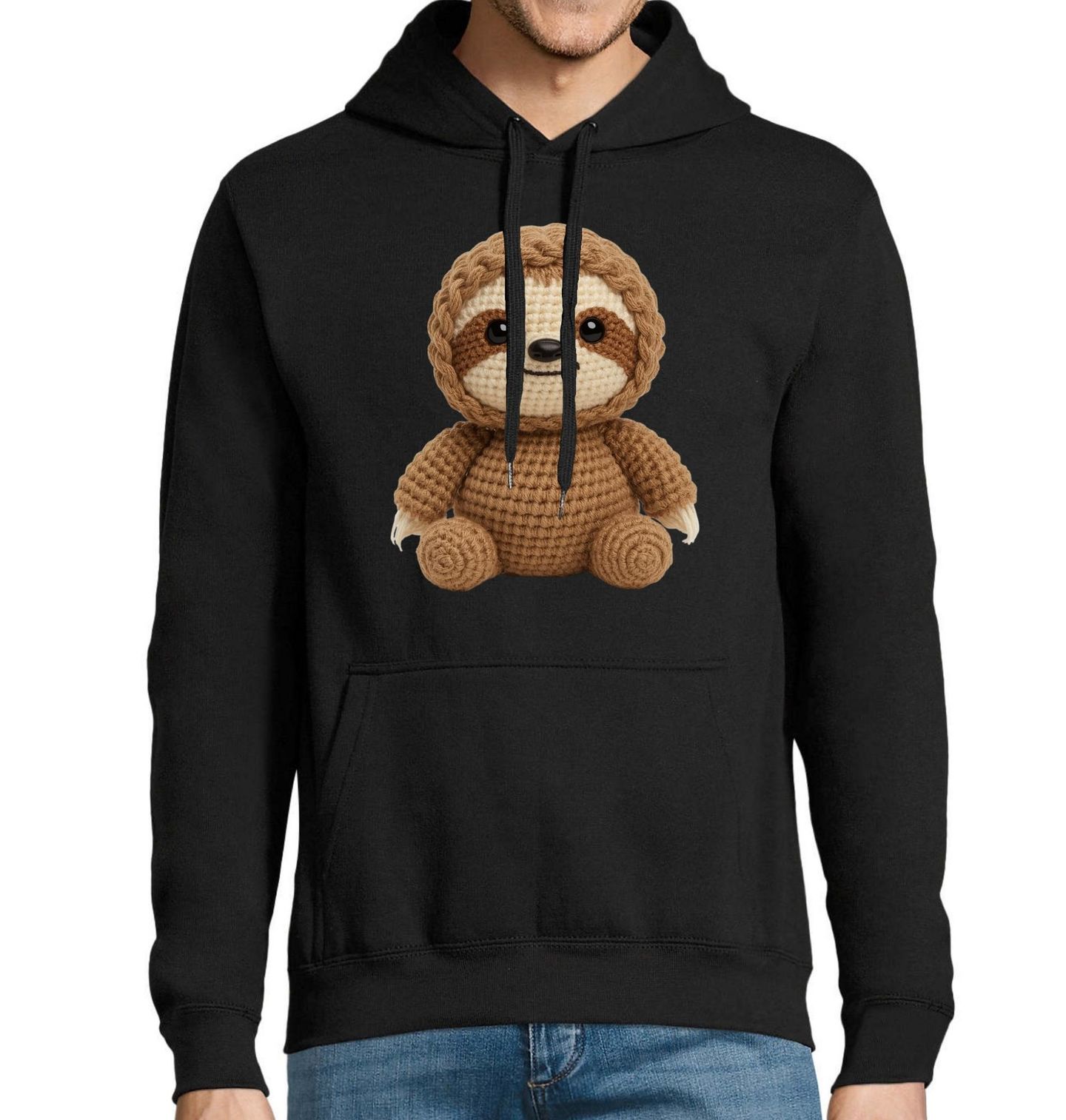 Pánská mikina Háčkovaný Lenochod. Motiv je vytištěný potiskem – nejedná se o výšivku ani háčkovaný 3D prvek! Něžný a hravý design, kde hlavní roli hraje usměvavý lenochod ve stylu ručně háčkované plyšové postavičky. Jemná textura a přírodní hnědé odstíny dodávají grafice útulný a originální vzhled.