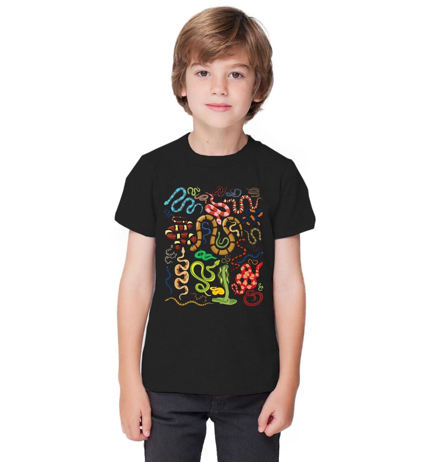 Dětské tričko Hadí Kolekce. Objevte jedinečný motiv plný barevných a fascinujících tvorů. Tento design zachycuje různé druhy hadů a přináší kouzlo světa plazů přímo na oblečení. Perfektní pro milovníky exotiky, přírody a reptilií. Had jako plaz symbolizuje sílu, obnovu a tajemství.