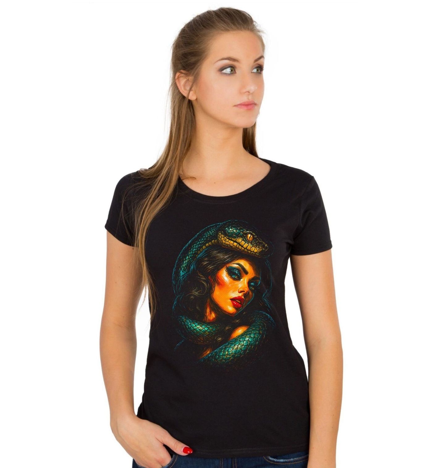 Dámské tričko Hadí Královna. Smyslnost, nebezpečí a temná přitažlivost – tento výrazný motiv zobrazuje had jako symbol pokušení, síly a zakázané touhy. Elegantní žena obklopená hadem představuje spojení krásy a hrozby, které fascinuje a zároveň varuje. Detailně propracovaný had se vine kolem postavy a dodává celému designu dynamiku i tajemnou energii.