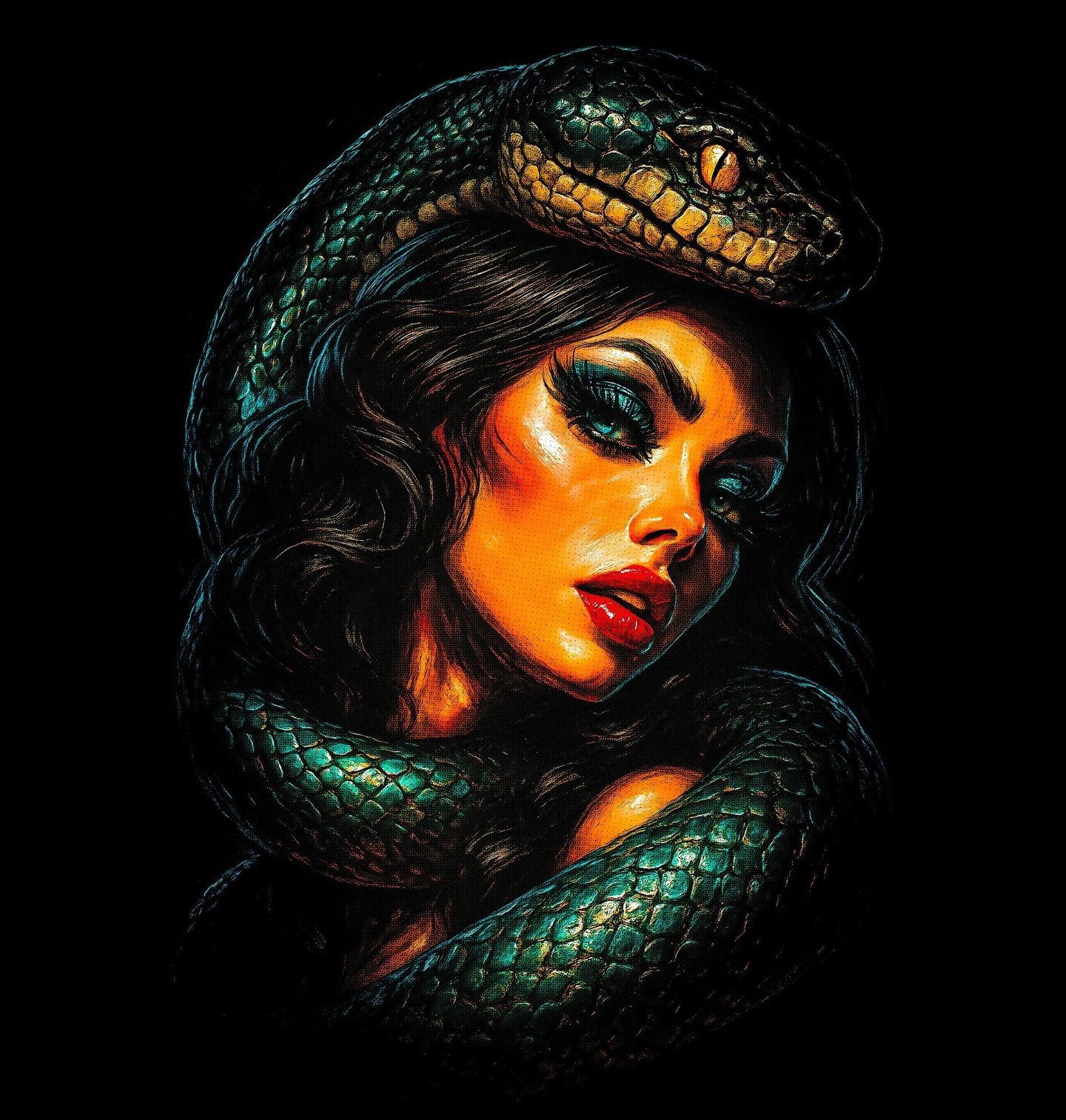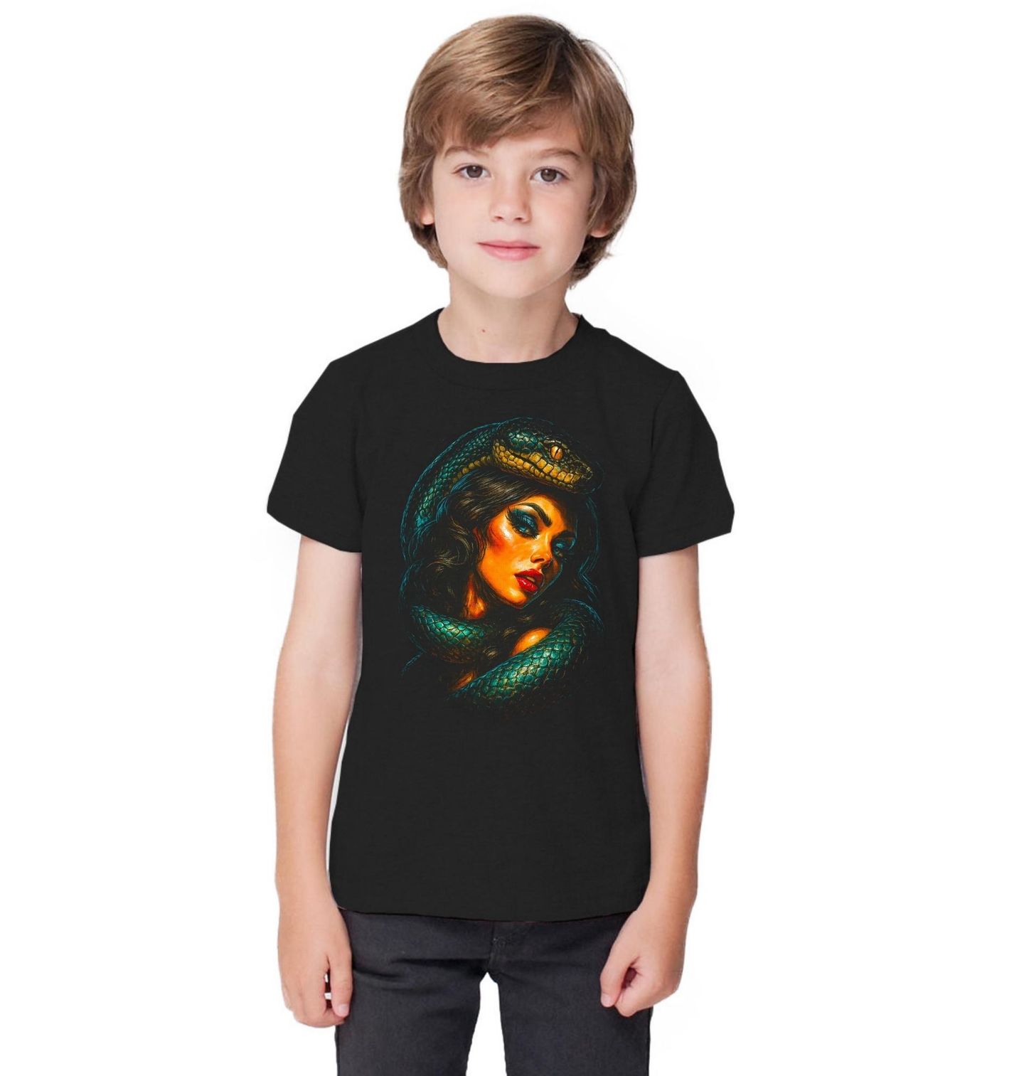 Dětské tričko Hadí Královna. Smyslnost, nebezpečí a temná přitažlivost – tento výrazný motiv zobrazuje had jako symbol pokušení, síly a zakázané touhy. Elegantní žena obklopená hadem představuje spojení krásy a hrozby, které fascinuje a zároveň varuje. Detailně propracovaný had se vine kolem postavy a dodává celému designu dynamiku i tajemnou energii.