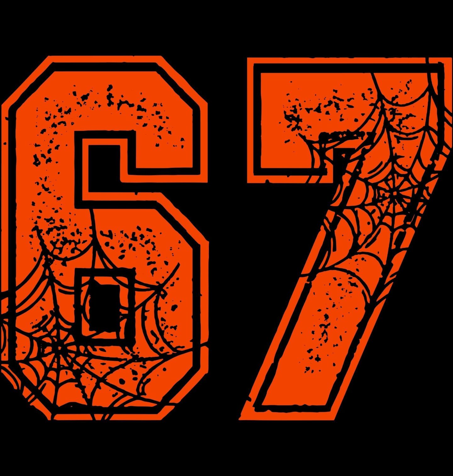 Pánské tričko Halloweenský Meme 67 Six Seven Spider. Originální motiv 67 ve výrazném oranžovo-černém designu s pavoučími sítěmi. Číslice 6 a 7 odkazují na populární internetový meme six seven, který si získal oblibu díky své absurdnosti a jednoduchosti. Tento kousek doplňuje detailní ilustrace pavouka a sítí, což z něj dělá ideální volbu pro fanoušky temného humoru, Halloweenu a netradičních designů.