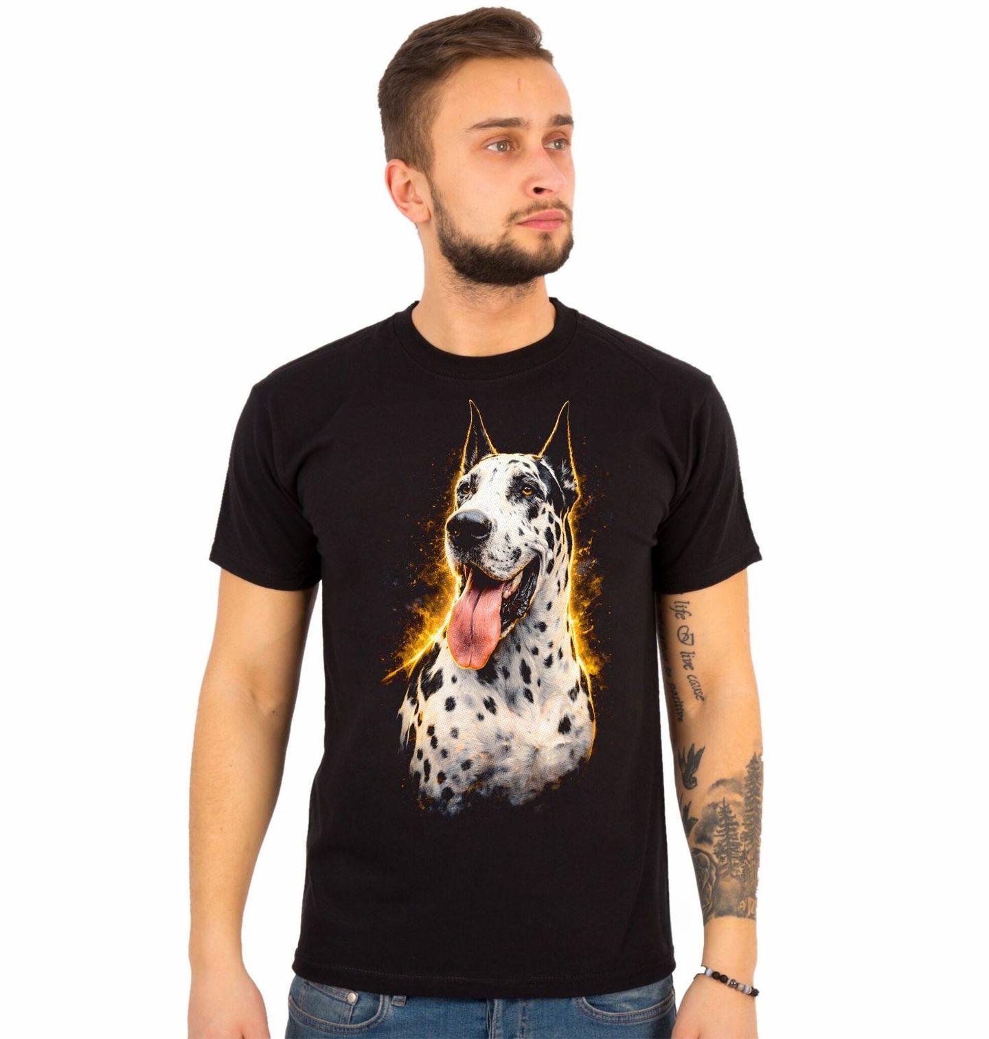 Pánské tričko Harlekýnská Německá doga. Skvrnitá německá doga neboli harlekýn je geneticky jedinec bílý černě strakatý. Typické černé skvrny na bílém podkladu (harlekýn zbarvení), dlouhá hlava a vzpřímené uši dodávají tomuto portrétu jedinečný a majestátní vzhled. Každý pejskař ocení sílu, eleganci a noblesu, kterou tento pes vyzařuje. Pokud jsi pejskař a obdivuješ velká plemena, je tento motiv ideální volbou.