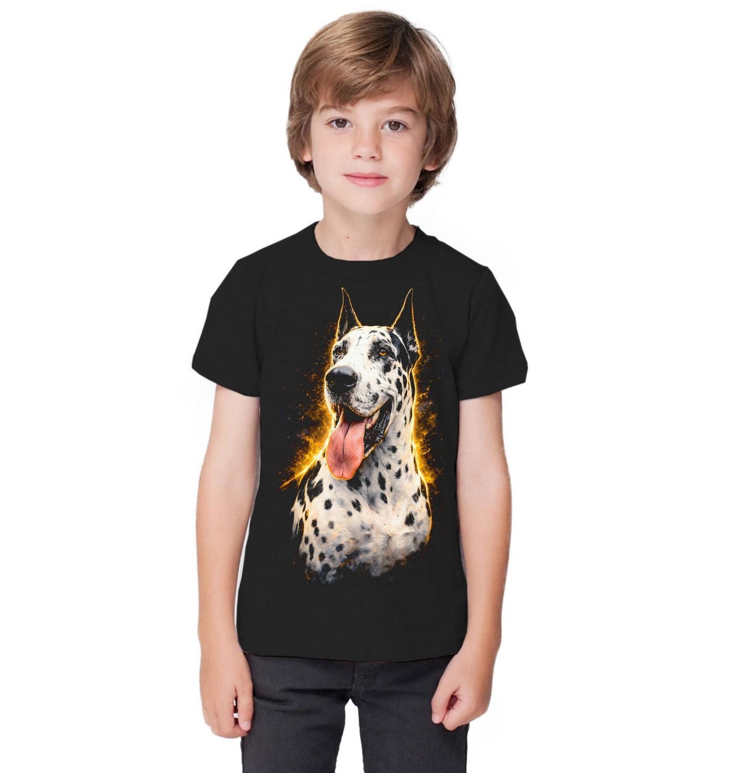 Dětské tričko Harlekýnská Německá doga. Skvrnitá německá doga neboli harlekýn je geneticky jedinec bílý černě strakatý. Typické černé skvrny na bílém podkladu (harlekýn zbarvení), dlouhá hlava a vzpřímené uši dodávají tomuto portrétu jedinečný a majestátní vzhled. Každý pejskař ocení sílu, eleganci a noblesu, kterou tento pes vyzařuje. Pokud jsi pejskař a obdivuješ velká plemena, je tento motiv ideální volbou.