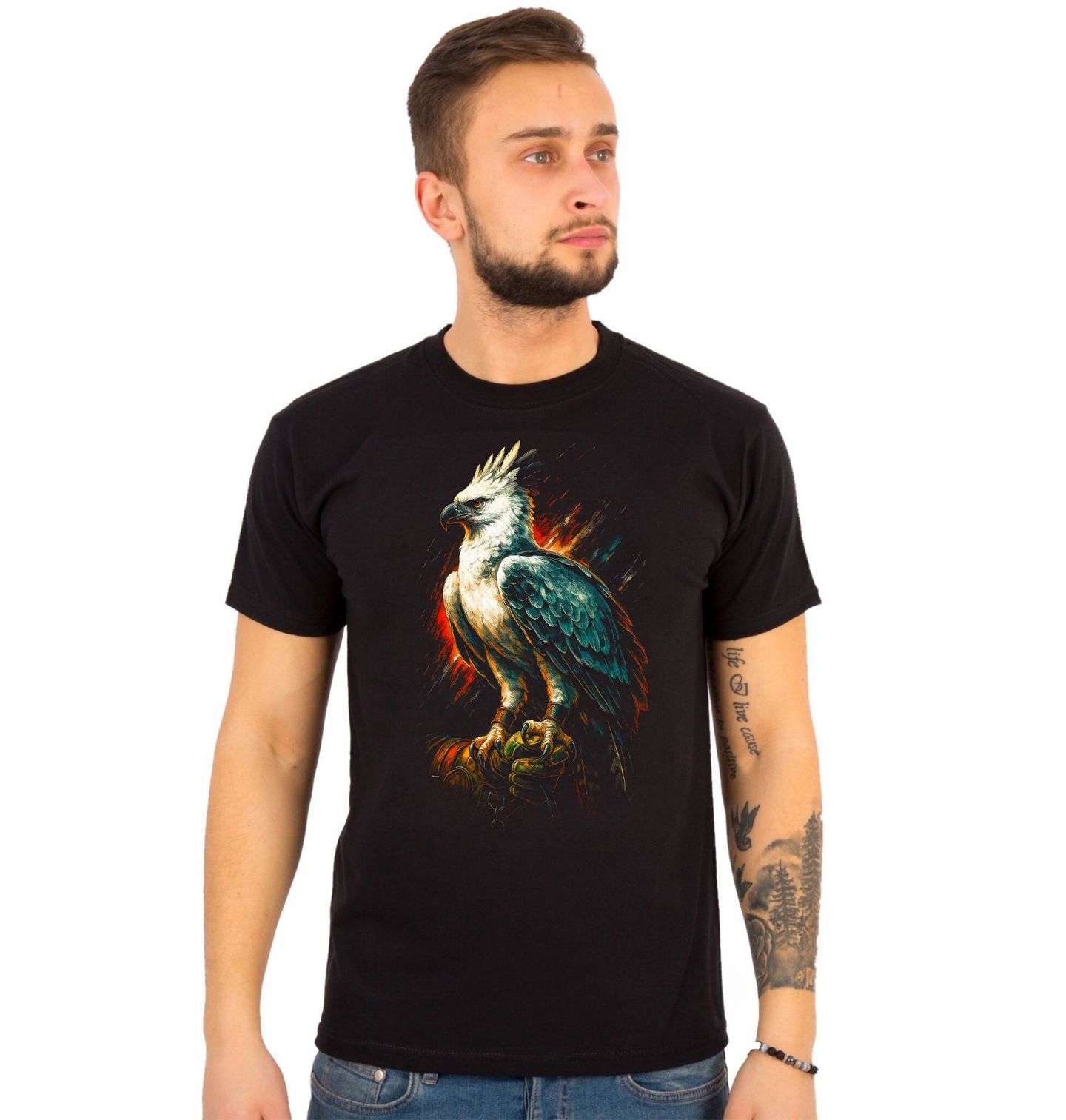 Pánské tričko Harpyje pralesní. Tento motiv zachycuje ptáka harpyji pralesní, jednoho z nejmohutnějších dravých orlů tropických deštných lesů Jižní Ameriky. Harpyje pralesní (Harpia harpyja) je symbol síly, ostražitosti a nezkrotné přírody. Detailní zpracování peří, výrazná chocholka a masivní pařáty dávají tomuto motivu jedinečný dramatický charakter.