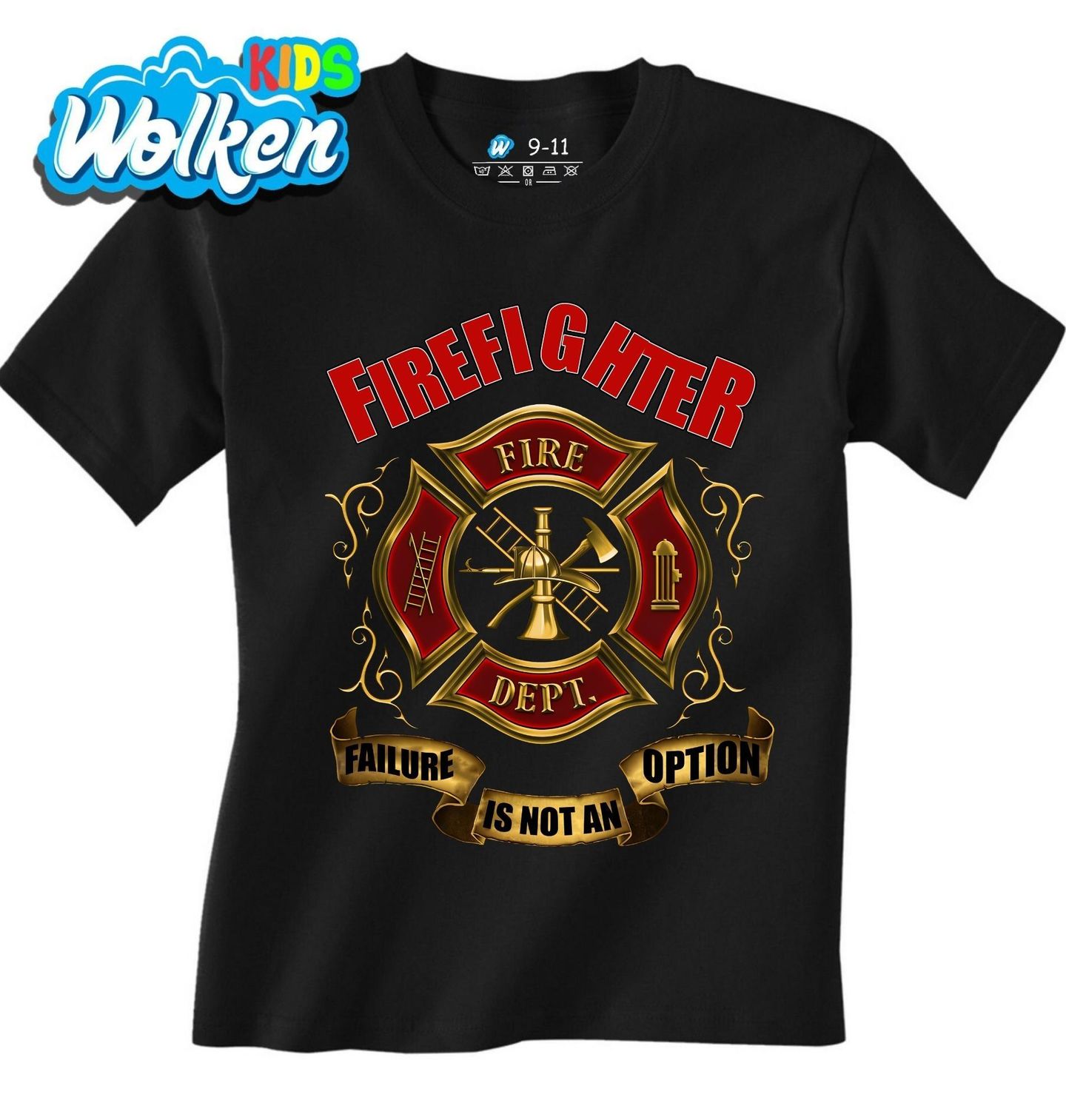 Dětské tričko Hasičský znak odvahy. Uprostřed je hasičský znak s helmou, žebříkem, sekerou a proudnicí, kolem něj nápis Fire Dept. a výrazné heslo Failure is not an option – selhání není možnost. Tento motiv je symbolem statečnosti a odhodlání, které k profesi hasič patří.