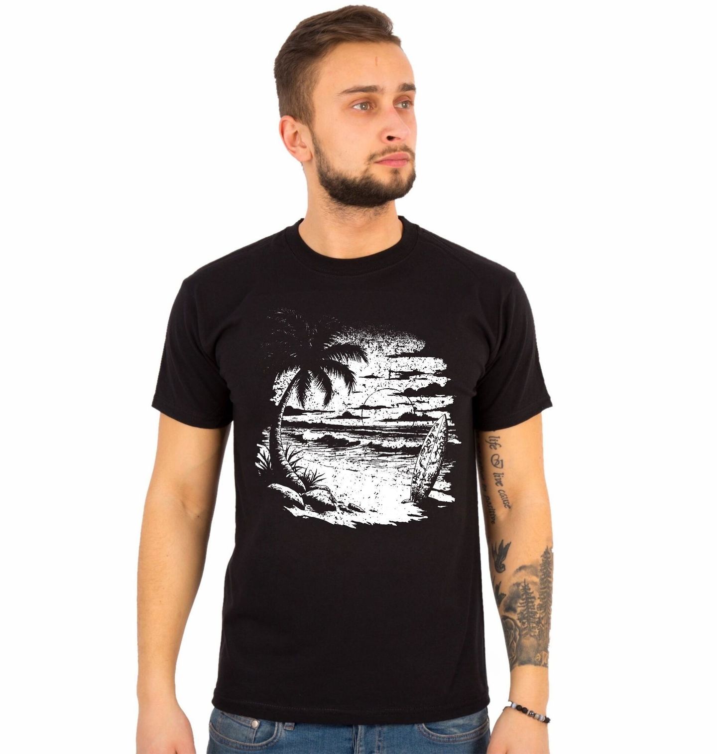Pánské tričko Havajská Pláž. Tento originální motiv přináší atmosféru tropického ráje, kde se divoké vlny tříští o břeh a klidná pláž zve k odpočinku. Nekonečné moře v kombinaci s ikonickými siluetami palmy vytváří dokonalou scenérii inspirovanou destinací Hawaii, která je snem každého milovníka oceánu. Nechybí ani surf, symbol svobody a dobrodružství, který podtrhuje energii celého designu.