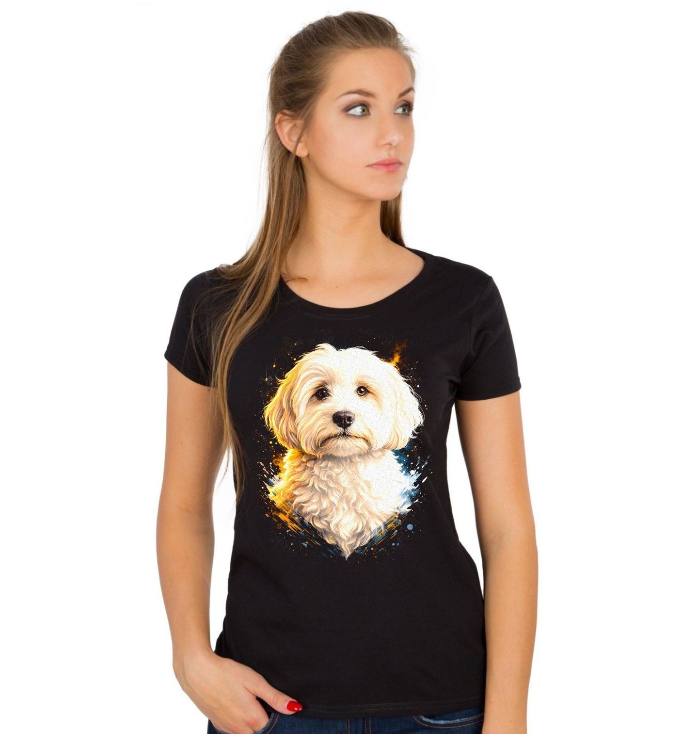 Dámské tričko Havanský psík. Tento krásný motiv zachycuje něžného psa plemene Maltézský psík v zářivém, uměleckém stylu plném kontrastních barev. Detailní ilustrace zvýrazňuje dlouhou, hedvábnou srst, jemný výraz a přátelskou povahu, díky které je tento pes ideálním společníkem do každé rodiny.