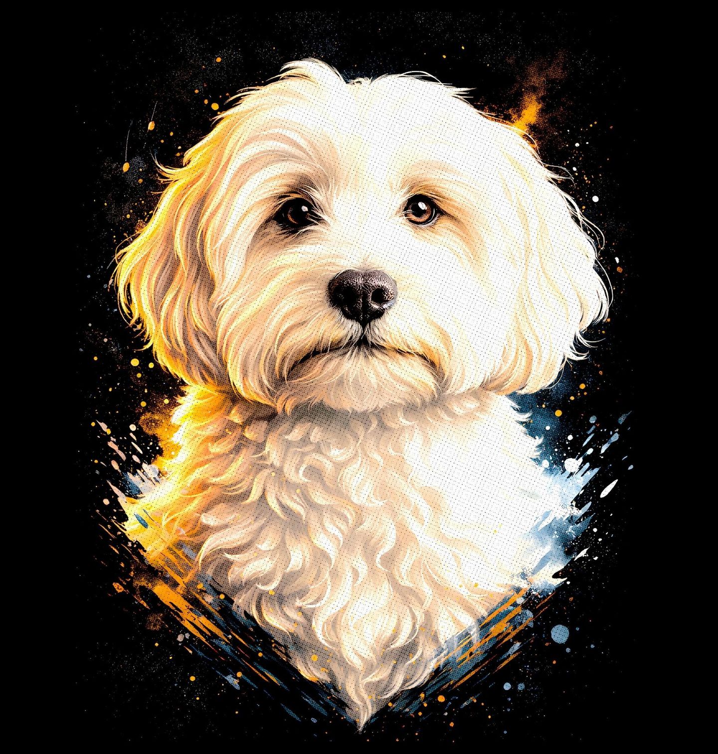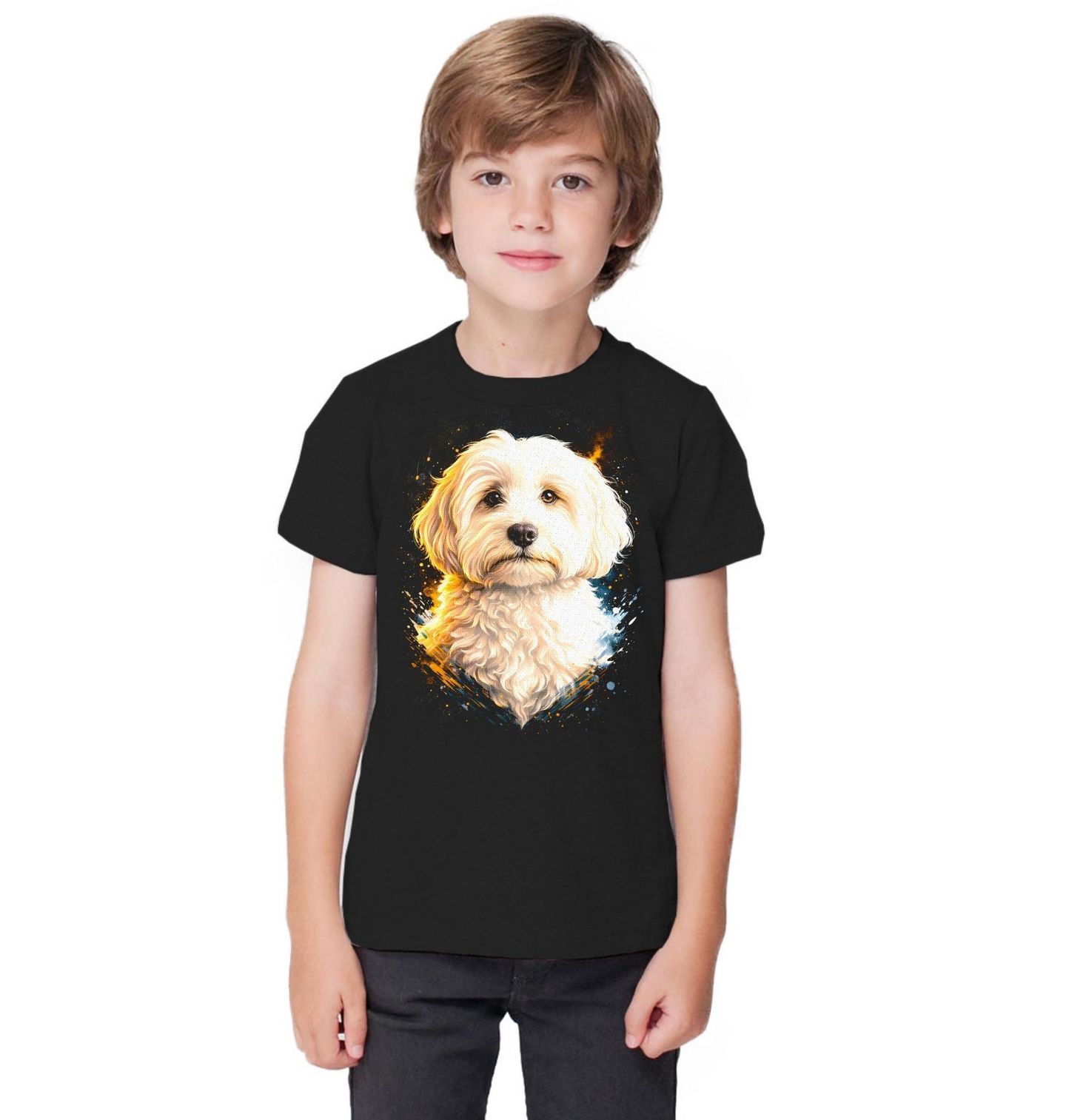 Dětské tričko Havanský psík. Tento krásný motiv zachycuje něžného psa plemene Maltézský psík v zářivém, uměleckém stylu plném kontrastních barev. Detailní ilustrace zvýrazňuje dlouhou, hedvábnou srst, jemný výraz a přátelskou povahu, díky které je tento pes ideálním společníkem do každé rodiny.