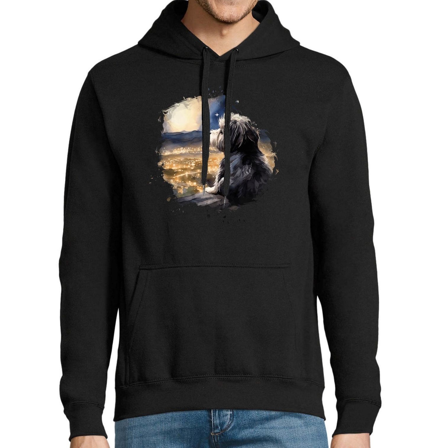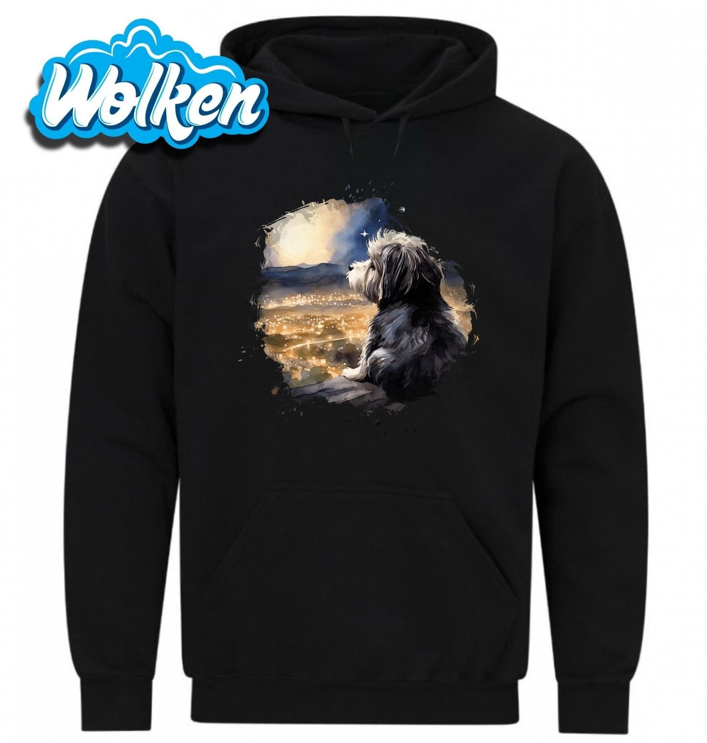 Pánská mikina Havanský psík na Vyhlídce. Havanský psík pozorující noční město z výšky je jako stvořený pro snílky a každého opravdového pejskaře. Tento věrný pes sleduje světla pod sebou, zatímco kolem něj panuje tichá noční atmosféra. Motiv v sobě spojuje městský život, lásku ke zvířatům a kouzlo nočních chvilek.