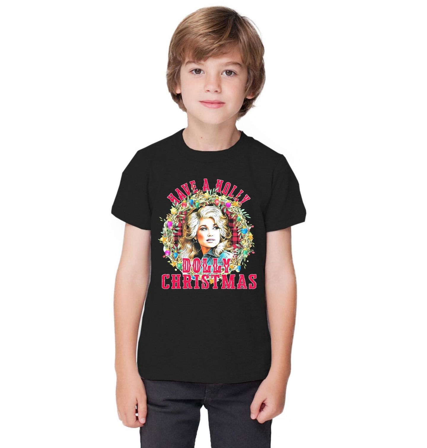 Dětské tričko Have a Holly Dolly Christmas. Vánoce mají letos hvězdný lesk s touto originální grafikou inspirovanou country ikonou! Motiv „Have a Holly Dolly Christmas“ je hříčkou na tradiční „Have a Holly Jolly Christmas“ – a v hlavní roli září Dolly Parton, legendární zpěvačka, herečka a módní ikona.
