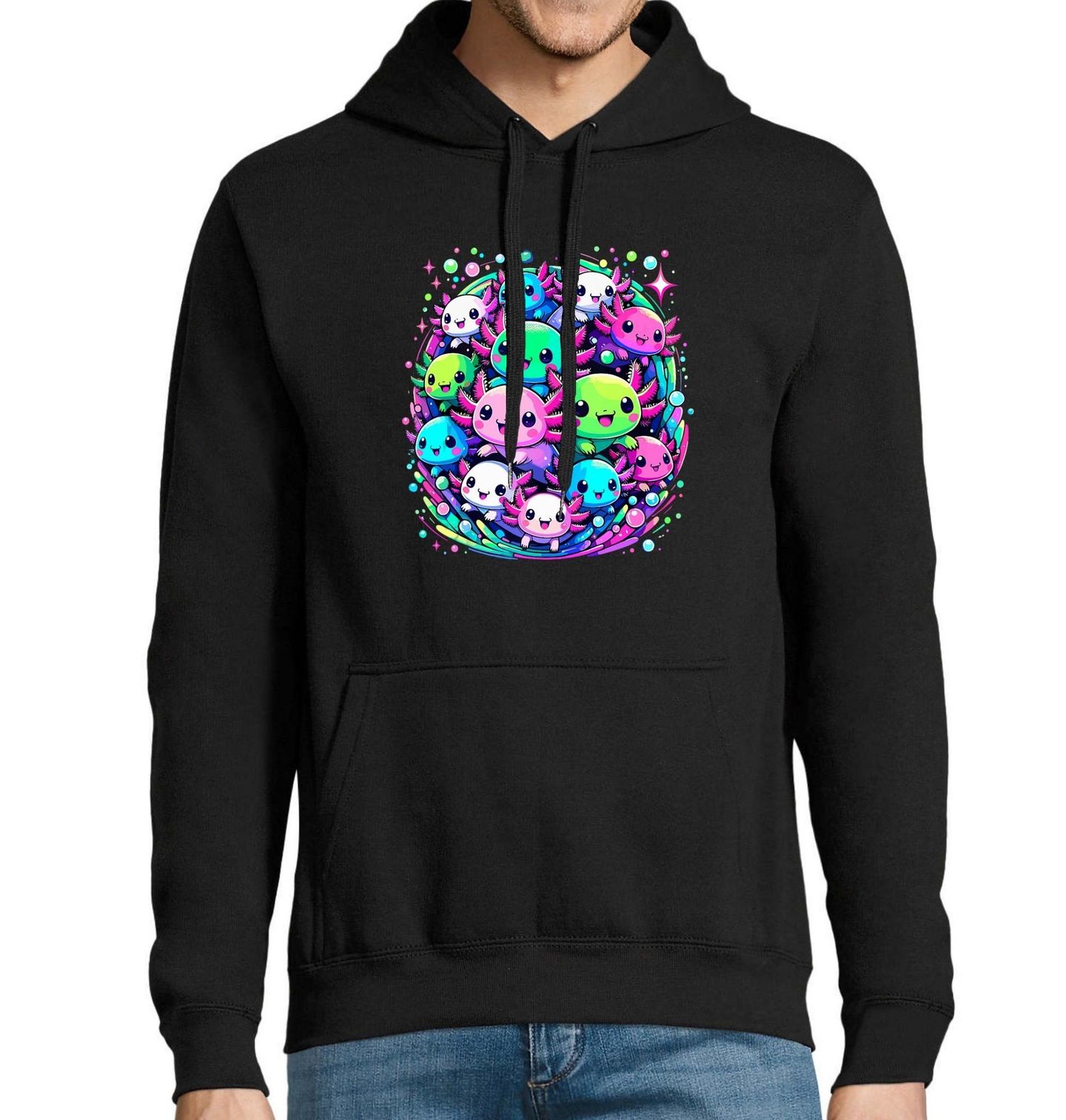 Pánská mikina Hejno Axolotlích Mláďat. Tento barevný motiv zachycuje celé hejno axolotlích mláďat, které svými úsměvy a zářivými barvami rozveselí každý den. Tričko s tímto originálním potiskem je skvělé pro milovníky axolotlů, hravého designu a pozitivní energie. Skvělý tip na dárek i způsob, jak ukázat, že axolotl patří mezi vaše nejoblíbenější tvory.