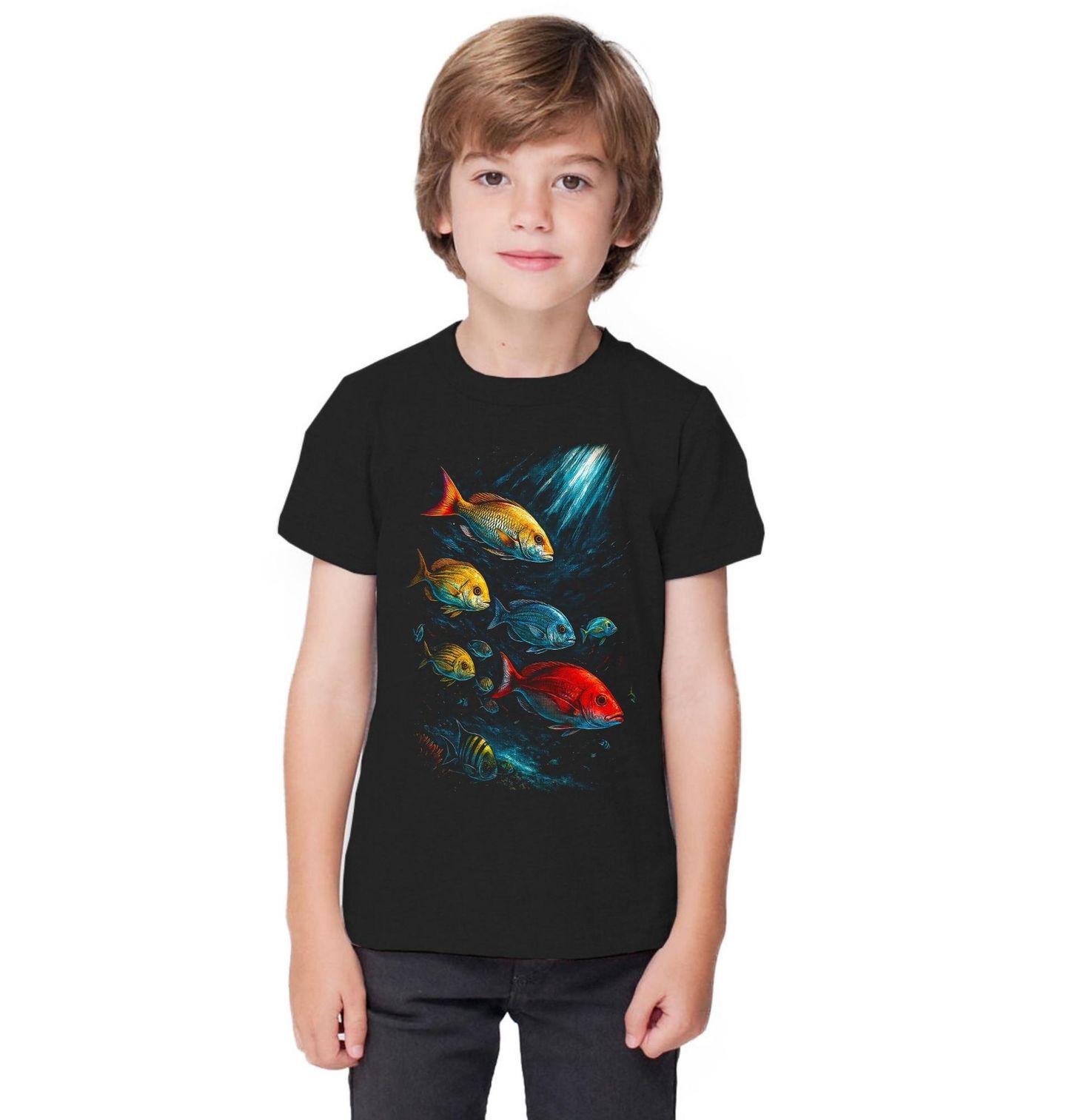 Dětské tričko Hejno ryb. Dynamický motiv zachycuje hejno mořských ryb v přirozeném pohybu pod hladinou, kde se mísí různé tvary, barvy a velikosti. Světlo pronikající vodou zvýrazňuje energii oceánu a pocit svobody, který je s mořem neodmyslitelně spojený. Tento design osloví každého rybáře, pro kterého je rybaření víc než jen úlovek.