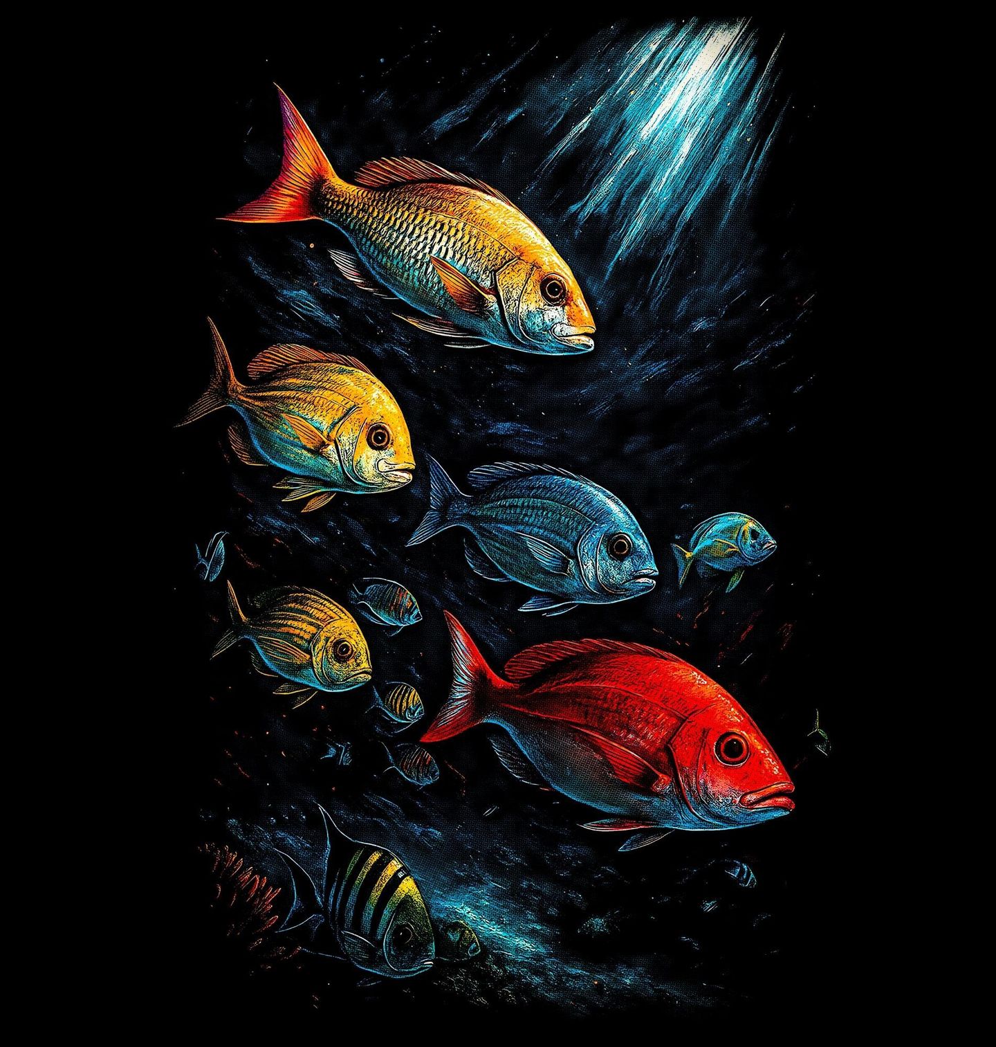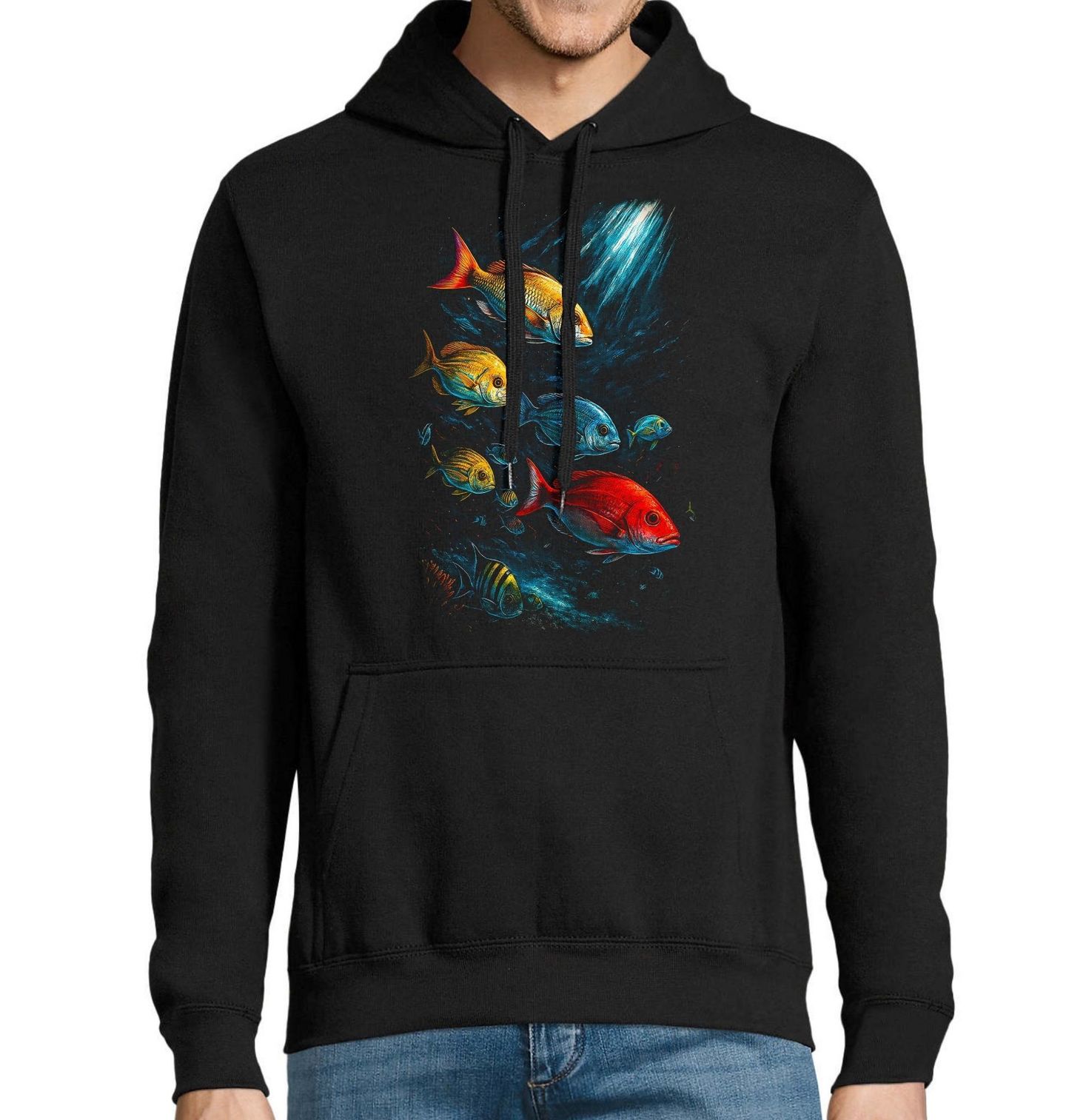 Pánská mikina Hejno ryb. Dynamický motiv zachycuje hejno mořských ryb v přirozeném pohybu pod hladinou, kde se mísí různé tvary, barvy a velikosti. Světlo pronikající vodou zvýrazňuje energii oceánu a pocit svobody, který je s mořem neodmyslitelně spojený. Tento design osloví každého rybáře, pro kterého je rybaření víc než jen úlovek.
