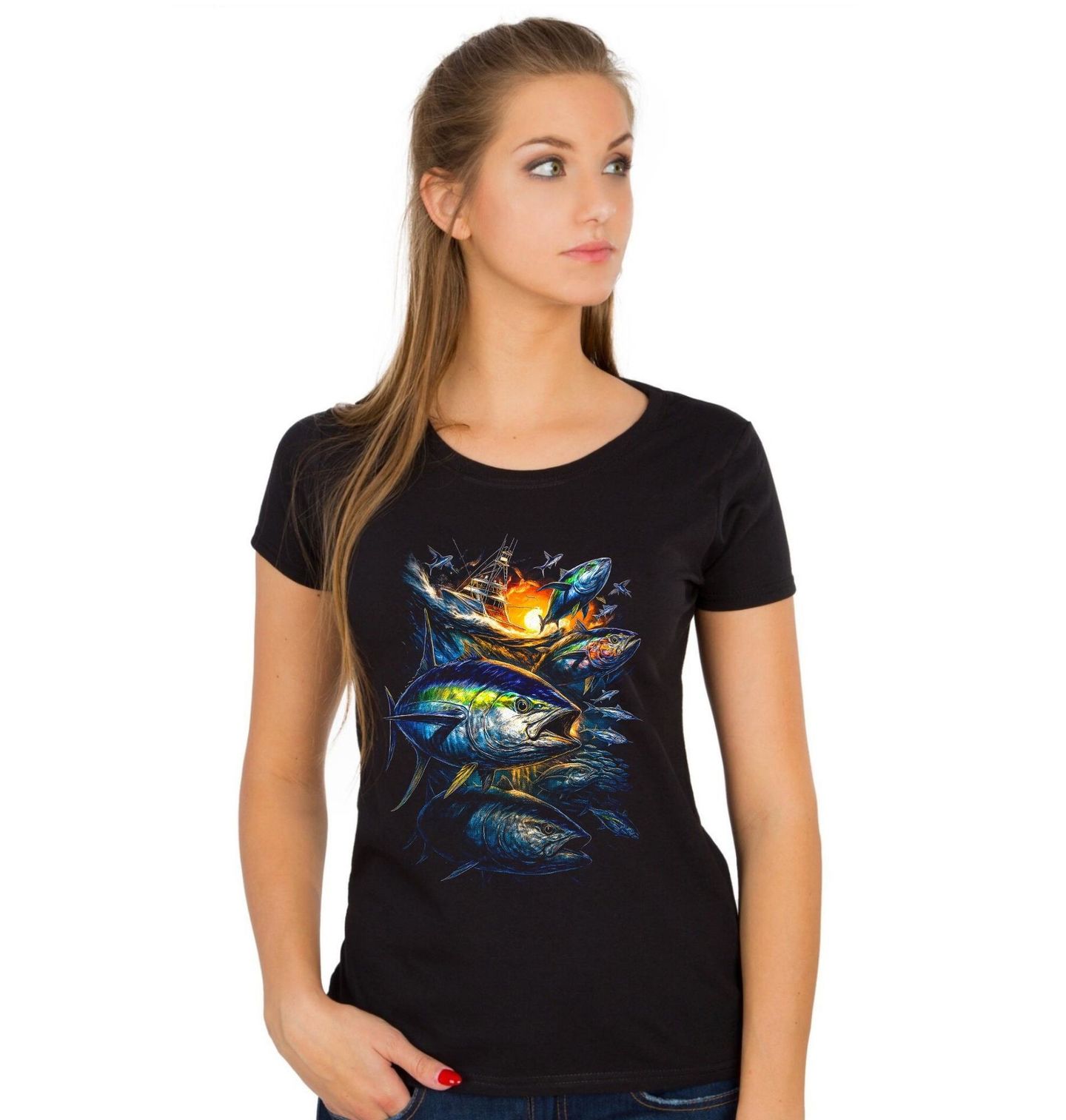 Dámské tričko Hejno Tuňáků žlutoploutvých. Tento dynamický motiv zachycuje tuňáka žlutoploutvého (Thunnus albacares) – jednu z nejrychlejších a nejsilnějších ryb otevřeného oceánu. Rybaření na tuňáka patří k nejtěžším disciplínám mořského rybolovu. Každý zkušený rybář ví, že souboj s touto rybou není o štěstí, ale o fyzické síle, výdrži a perfektní technice.