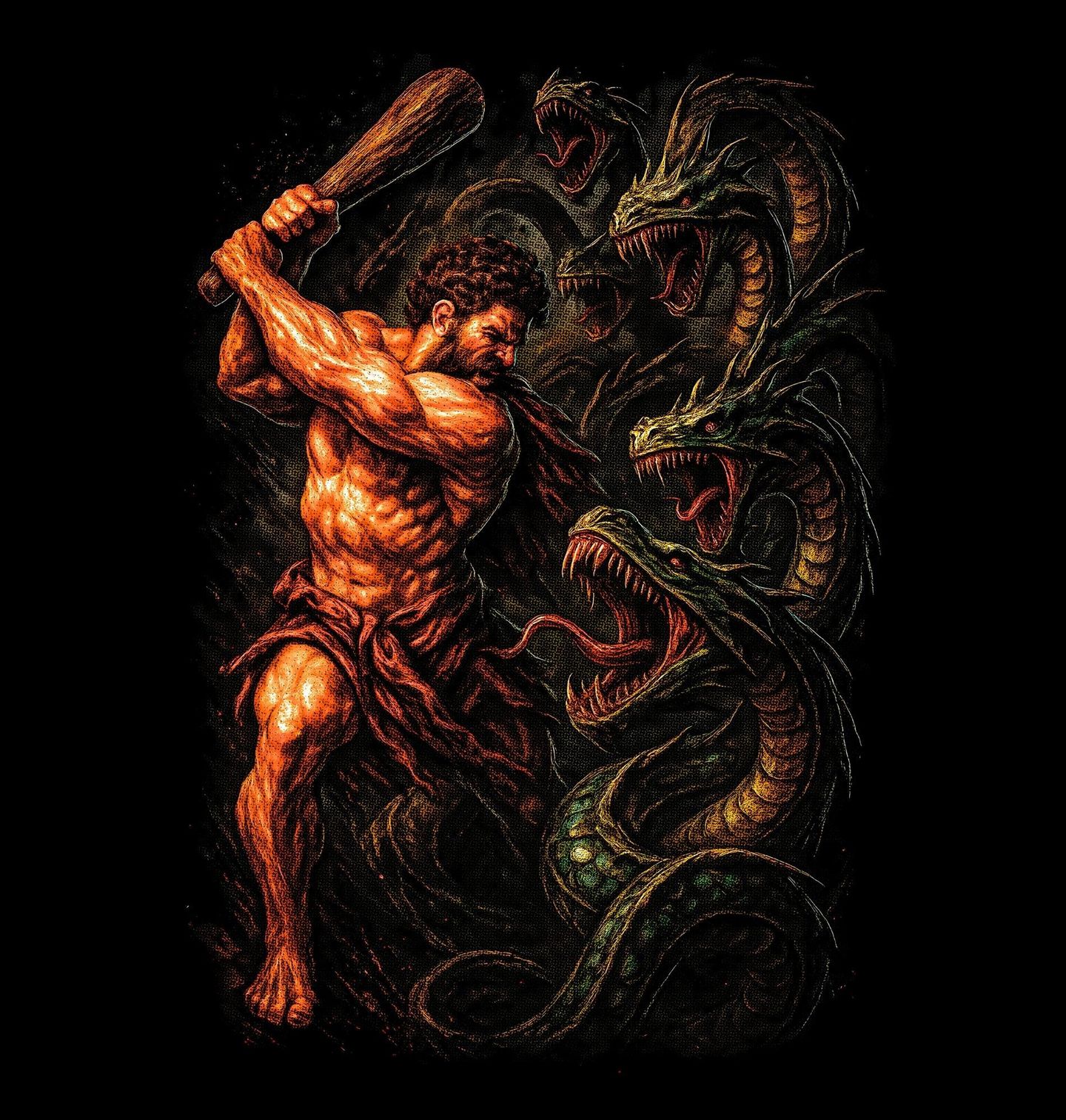 Dětské tričko Héraklés bojující s Hydrou. Héraklés (latinsky Herkules) je nejvýznamnější hrdina řecké mytologie, syn boha Dia a smrtelnice Alkmény, proslulý nadlidskou silou, odvahou a dvanácti těžkými úkoly. Héraklés musel vykonat 12 úkolů jako trest a očištění za čin, který spáchal v záchvatu šílenství. Jedním z nich bylo zabít mnohahlavou Hydru, smrtícího netvora, kterému po useknutí hlavy narůstaly další. Hydra je v řecké mytologii obluda s hadím tělem a devíti dračími hlavami
