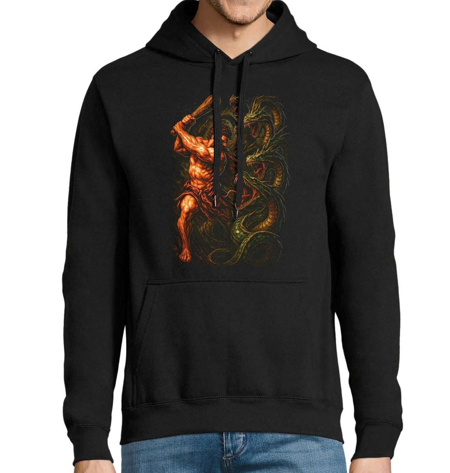 Pánská mikina Héraklés bojující s Hydrou. Héraklés (latinsky Herkules) je nejvýznamnější hrdina řecké mytologie, syn boha Dia a smrtelnice Alkmény, proslulý nadlidskou silou, odvahou a dvanácti těžkými úkoly. Héraklés musel vykonat 12 úkolů jako trest a očištění za čin, který spáchal v záchvatu šílenství. Jedním z nich bylo zabít mnohahlavou Hydru, smrtícího netvora, kterému po useknutí hlavy narůstaly další. Hydra je v řecké mytologii obluda s hadím tělem a devíti dračími hlavami