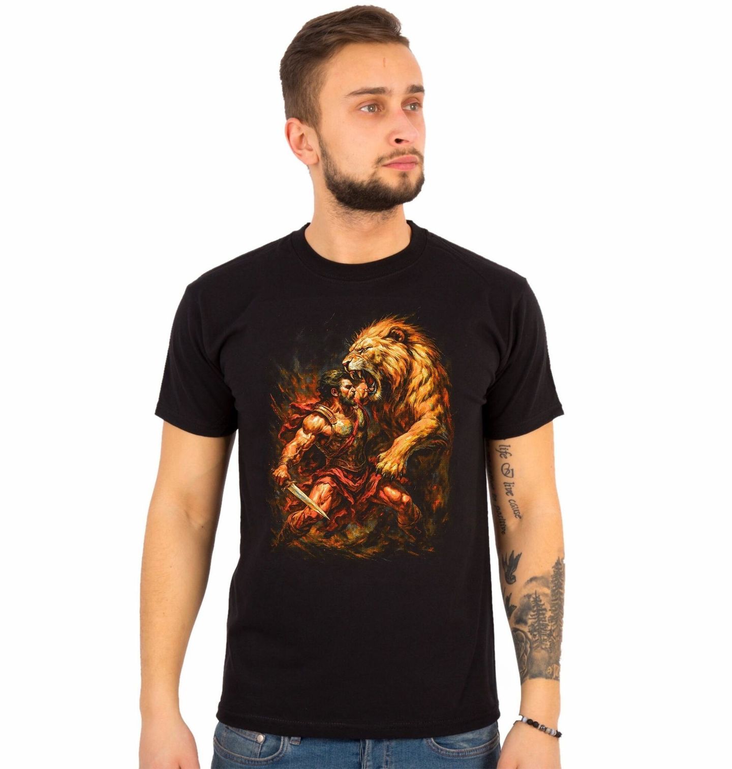 Pánské tričko Héraklés bojující s Nemejským lvem. Epický motiv zachycuje legendárního hrdinu Hérakla v dramatickém souboji s Nemejským lvem. Řecká mytologie popisuje tento střet jako první z dvanácti hrdinských úkolů, které měl splnit. Lev byl symbolem nepřemožitelnosti – jeho kůže byla neprůstřelná a žádná zbraň jej nedokázala zranit. Napětí mezi mužem a šelmou, vyceněné tesáky a odhodlaný výraz hrdiny vytvářejí scénu plnou energie, síly a odvahy.
