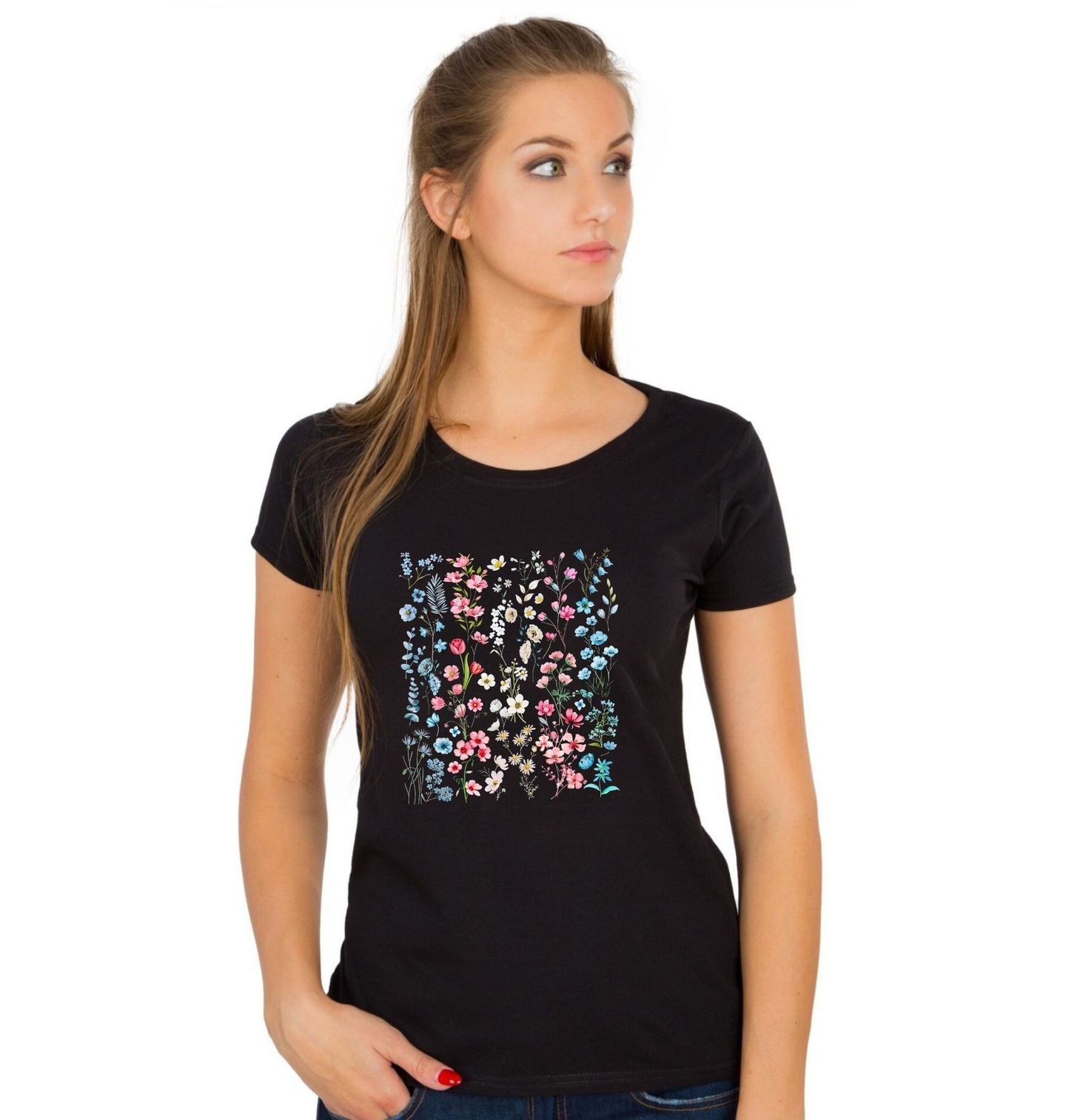 Dámské tričko Herbář Jarních Květin. Jemný a elegantní motiv, ve kterém hrají hlavní roli květiny v krásných pastelových barvách. Na černém pozadí vynikají drobné i větší květy v odstínech růžové, bílé a modré, díky čemuž působí celý design něžně, romanticky a zároveň moderně.