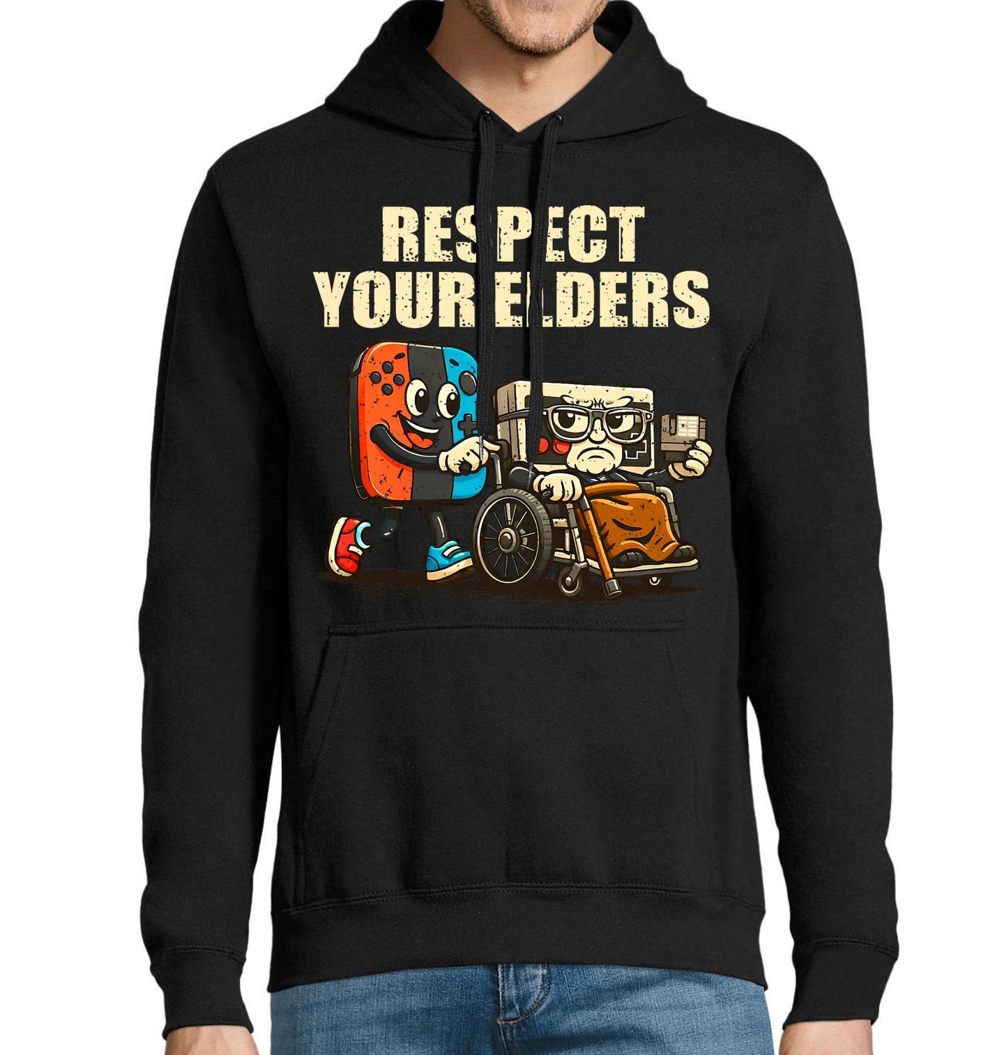 Pánská mikina Herní Konzole Respektuj Starší. Vtipný retro design s nápisem „Respect Your Elders“ (Respektuj své starší) ukazuje kontrast mezi moderním gamingem a starou herní klasikou. Postavičky ovladače a staré konzole vytvářejí hravou scénu plnou nostalgie. Tento design je perfektní pro všechny hráče, kteří si váží herní historie.