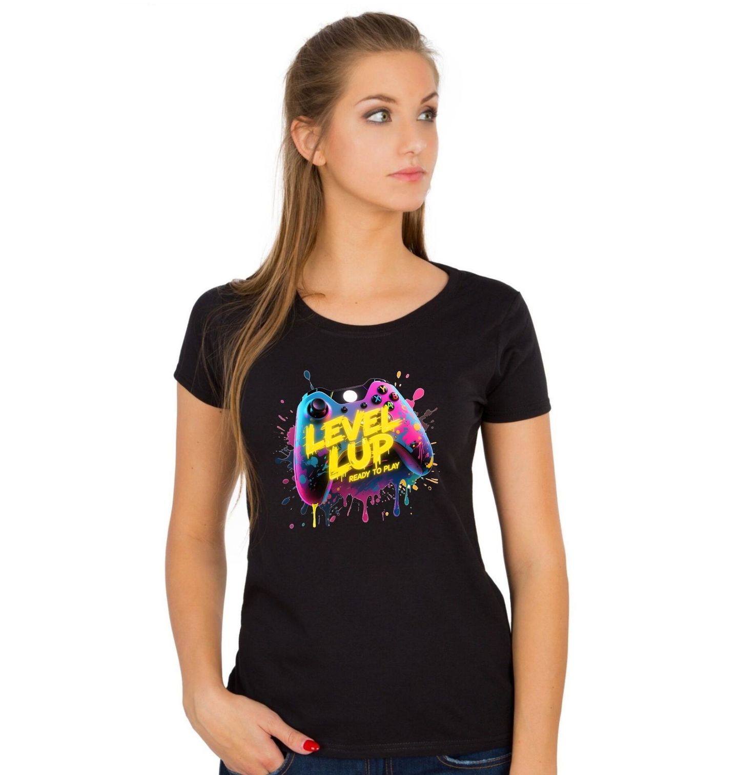 Dámské tričko Herní Ovladač LEVEL UP. Motiv zobrazuje barevný gamer ovladač s neonovým nápisem „LEVEL UP – READY TO PLAY“, což v překladu znamená „Postup na další úroveň – Připraven hrát“. Ideální motiv pro hráče, kteří žijí gamingem a berou každý den jako novou herní výzvu.