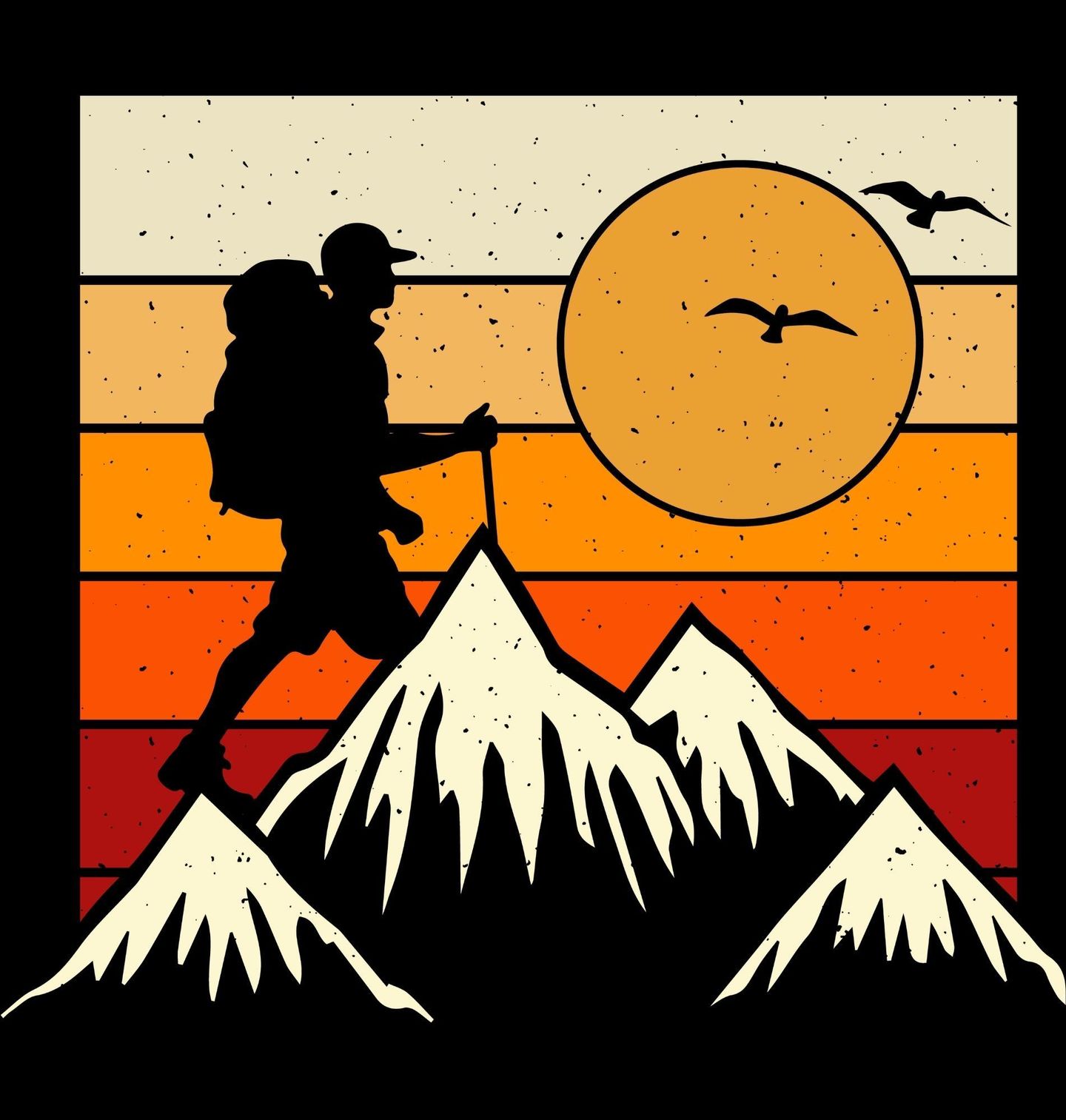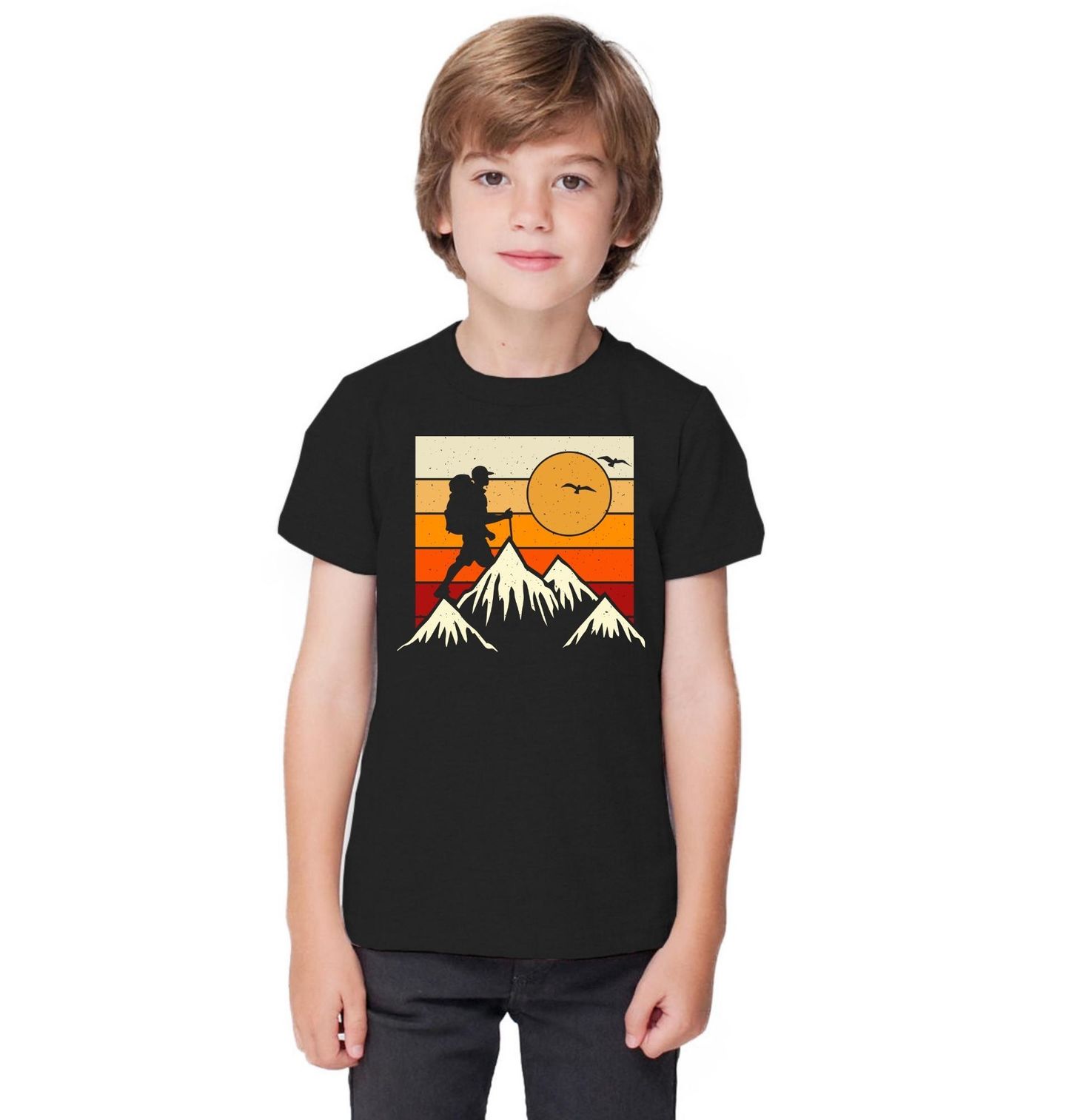 Dětské tričko Hiking při Západu Slunce. Stylový motiv inspirovaný přírodou a svobodou pohybu v horách přináší jedinečnou kombinaci retro barev a siluety turistického dobrodruha na vrcholu hor. Výrazné vrstvy západu slunce dodávají designu nostalgickou atmosféru, zatímco postava s batohem dokonale vystihuje vášeň pro hiking a objevování nových míst.