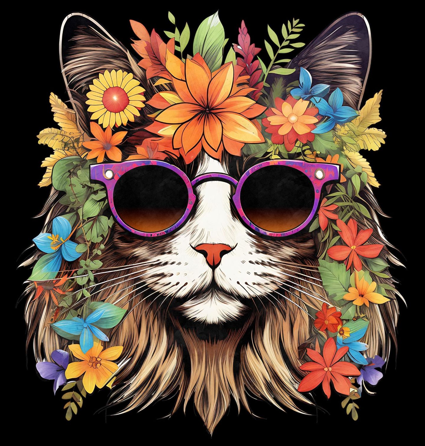 Dámské tričko Hippie Kočka. Tahle kočka ví, že největší síla je v klidu, lásce a květinách! Originální potisk s hippie kočka ozdobenou duhovými květiny a ikonickými brýlemi přináší totální pohodu a pozitivní vibrace. Ideální pro volnomyšlenkáře, milovníky přírody a všechny, kdo věří, že svět je krásnější s trochou barev a dobré nálady.