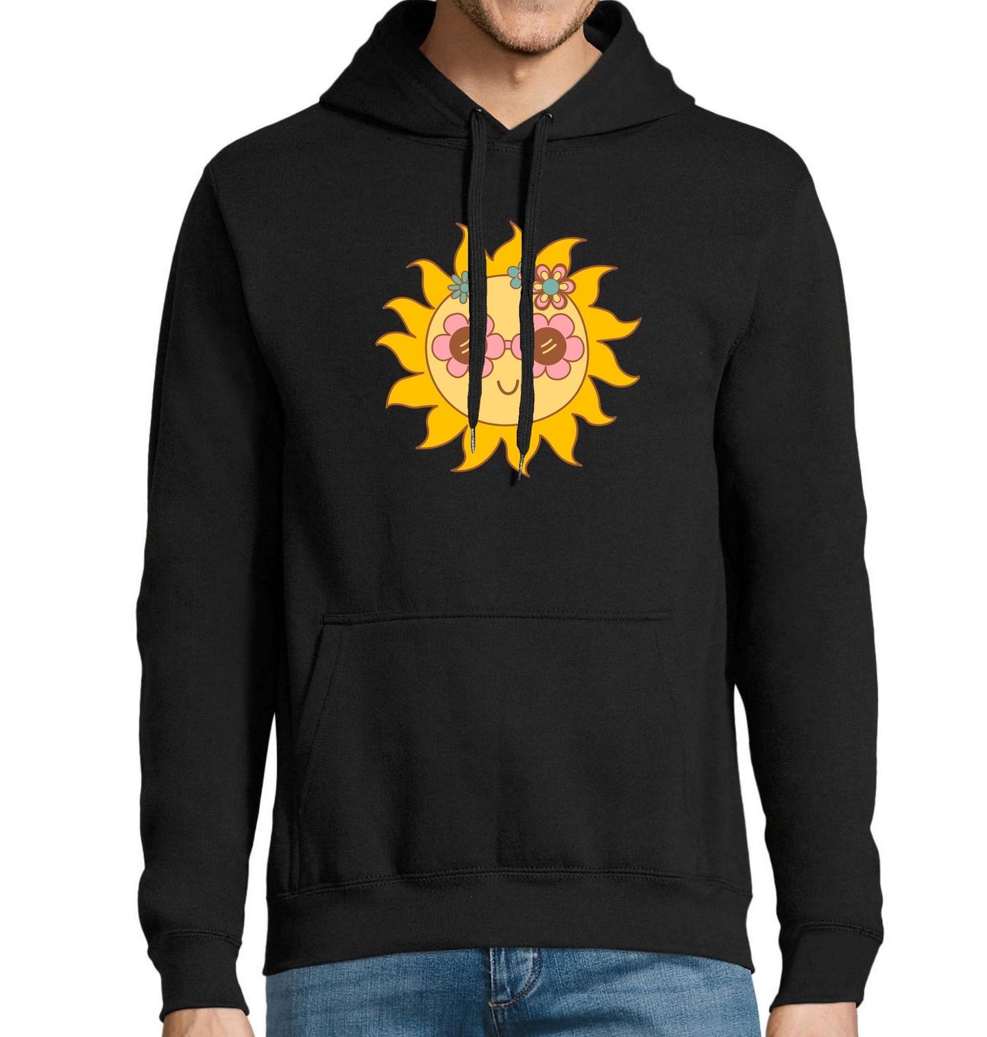 Pánská mikina Hippie Slunce. Užijte si každý den s tímto veselým a slunečným motivem! Roztomilé sluníčko s květinovými brýlemi a květinovou ozdobou vnáší do vašeho života pozitivní energii, letní pohodu a bezstarostnou náladu. Ideální design pro všechny, kdo chtějí šířit radost, optimismus a sluneční paprsky za každého počasí.