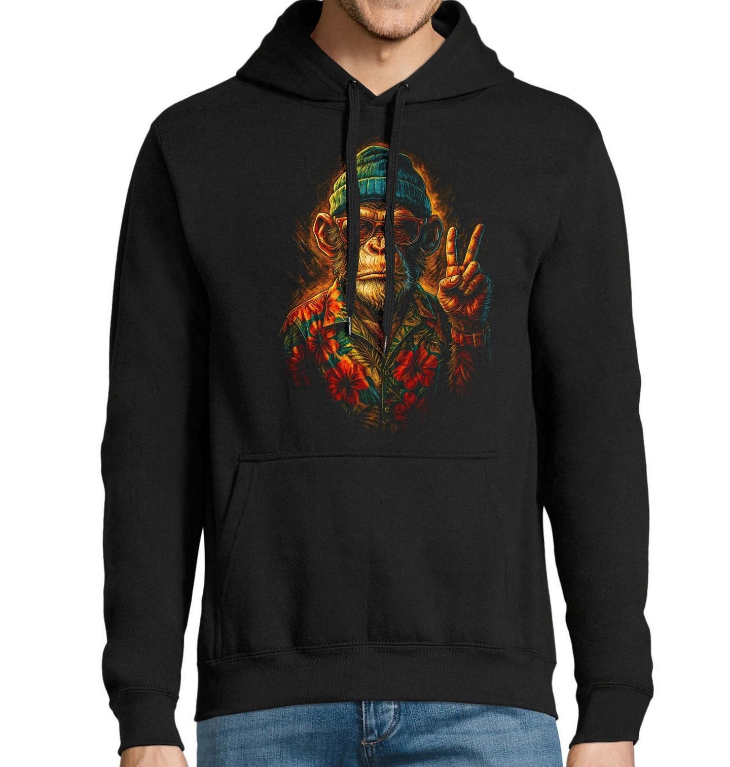 Pánská mikina Hipster Šimpanz Peace. Styl, nadhled a pořádná dávka cool energie – tento originální motiv zobrazuje opice konkrétně šimpanz v moderním „hipster“ stylu. Brýle, čepice a pohodový výraz spolu s gestem peace vytvářejí uvolněnou atmosféru plnou sebevědomí a pohody. mpanz je známý svou inteligencí a hravostí, což se dokonale promítá i do tohoto designu.