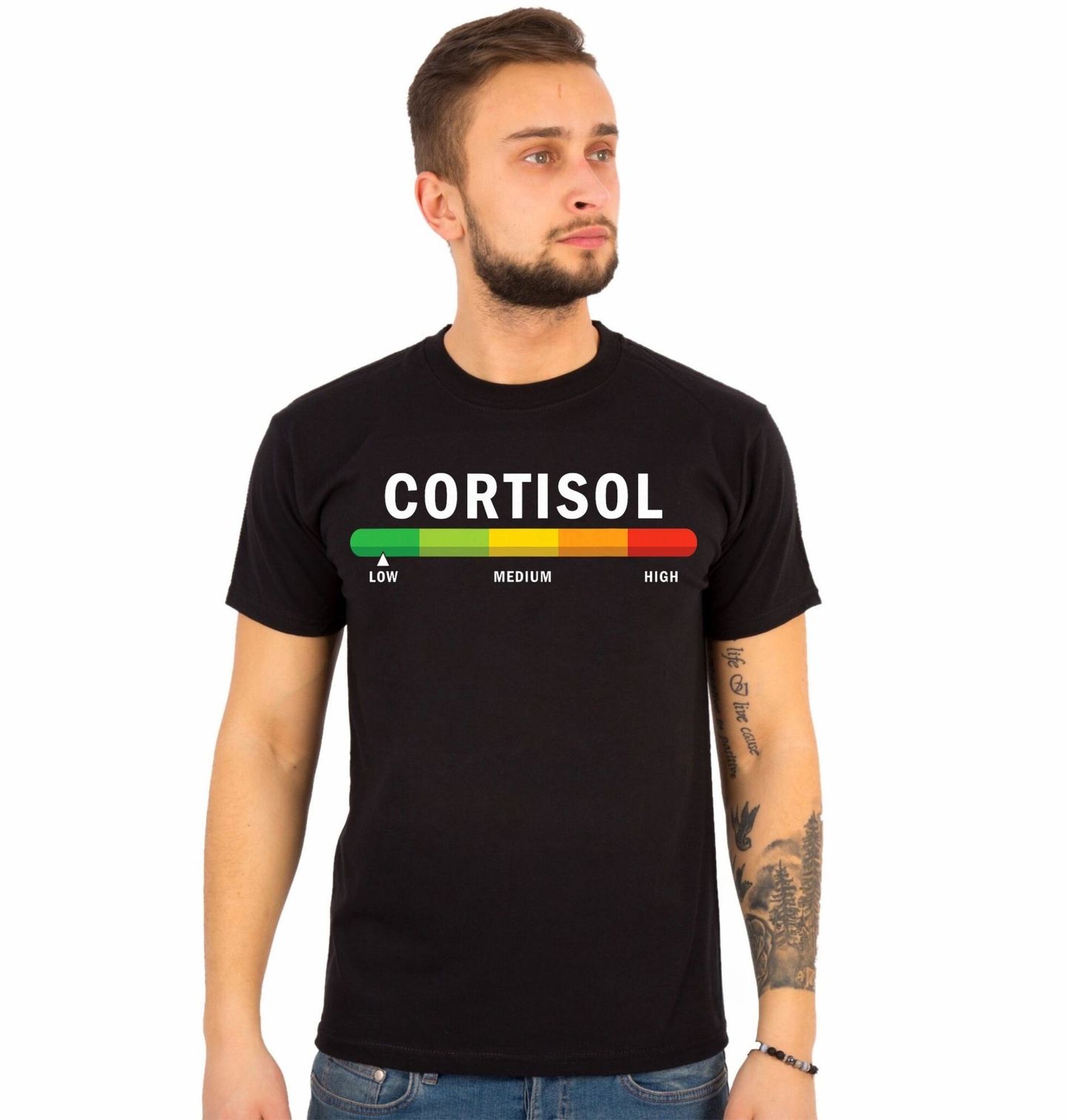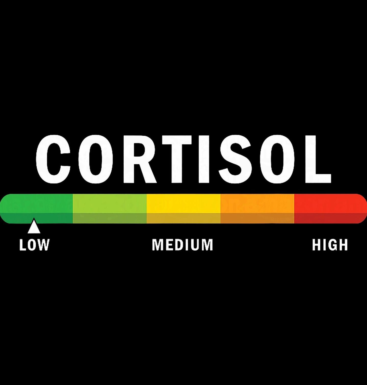 Pánské tričko Hladina Stresu Cortisol. Motiv znázorňuje, jak se mění hladina hormonu kortizolu od nízké po vysokou. Minimalistická vodorovná stupnice přehledně ukazuje přechod mezi „LOW“ (nízká), „MEDIUM“ (střední) a „HIGH“ (vysoká), což vystihuje každodenní výkyvy stresu, které kortizol v těle způsobuje.