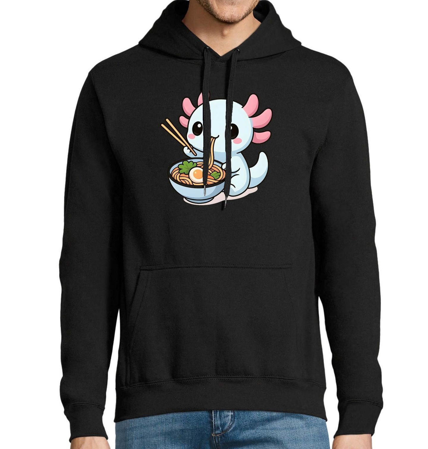 Pánská mikina Hladový Axolotl s Ramenem. Axolotl mexický si vychutnává misku lahodného ramenu s vajíčkem a bylinkami. Skvělý kousek pro milovníky japonské kuchyně, kawaii stylu a originální módy. Ideální na každodenní nošení i jako vtipný dárek pro fanoušky axolotlů a nudlí.