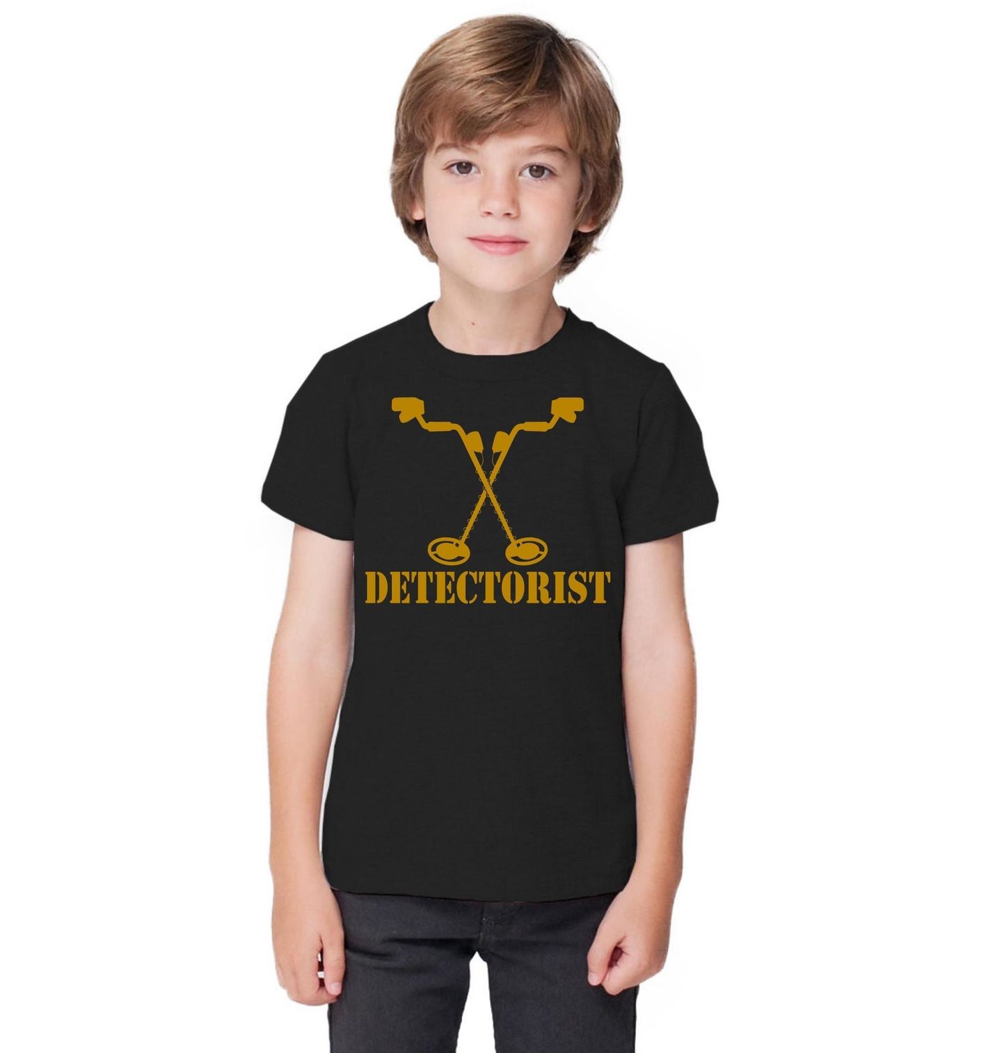 Dětské tričko Hledač Kovů Detektorist. Minimalistický a výrazný motiv znázorňuje zkřížený detektor kovů, symbolizující vášeň pro objevování skrytých pokladů a historii ukrytou pod povrchem země. Design jasně odkazuje na svět detektorářů, trpělivé hledání, dobrodružství a radost z každého nalezeného signálu.