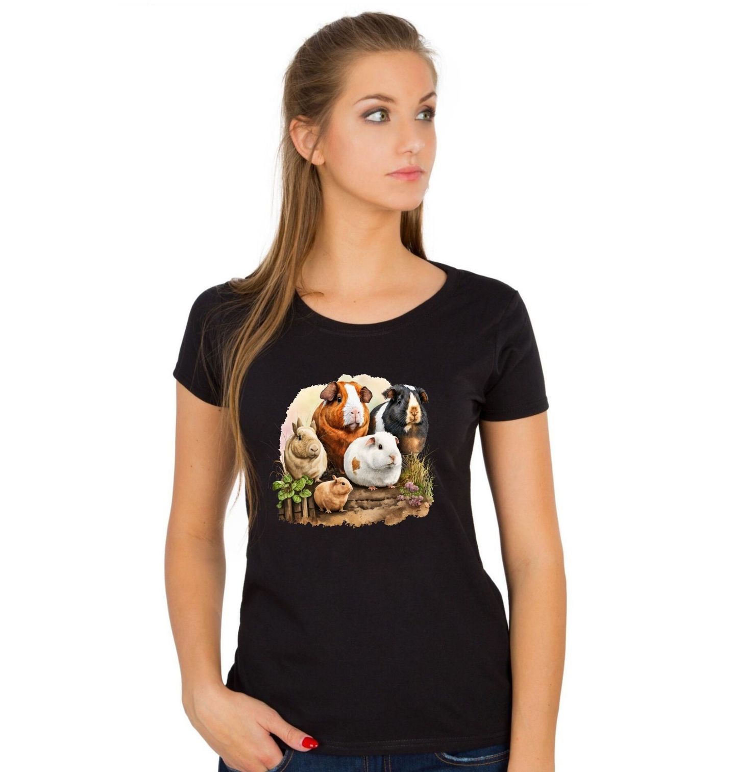 Dámské tričko Hlodavci na Venkově. Tento roztomilý motiv zachycuje skupinku domácích mazlíčků, kde je morče a kolem něj další morčata v různých barvách, ale také i králík a křeček. Na ilustraci jsou morčata s bílou a hnědou srstí, tříbarevné černobílo-hnědé morče, jemně krémové morče i zlatavé morče. Všechna působí jako hladkosrsté variety s krátkou, hebkou srstí.