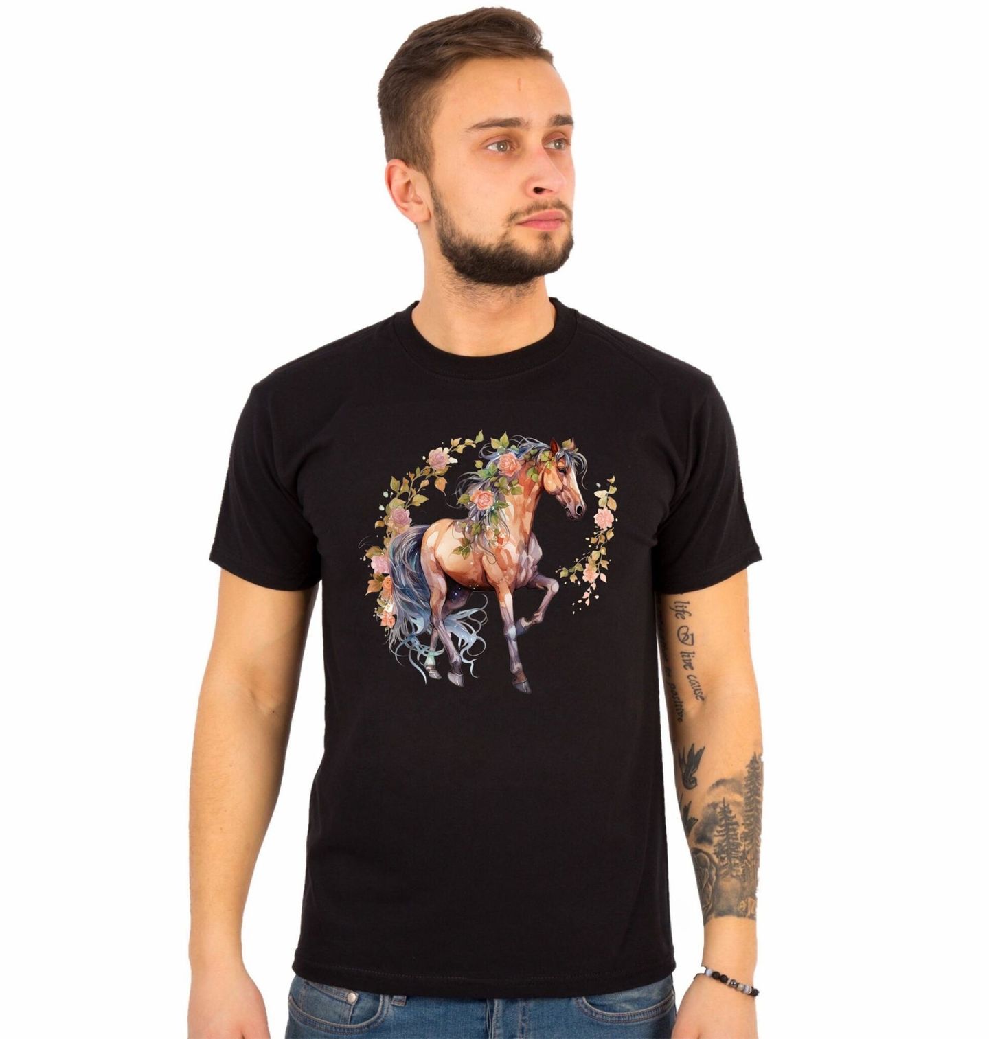 Pánské tričko Hnědák v Květinách. Jemný akvarelový motiv zachycuje hnědáka – krásný kůň v romantickém stylu doplněný o květiny a přírodní prvky. Ilustrace působí lehce, vzdušně a hodí se pro všechny milovníky koní, přírody i něžné estetiky. Kůň v teplých hnědých tónech symbolizuje sílu, klid i eleganci, zatímco květiny dodávají motivu harmonii a jemnost.