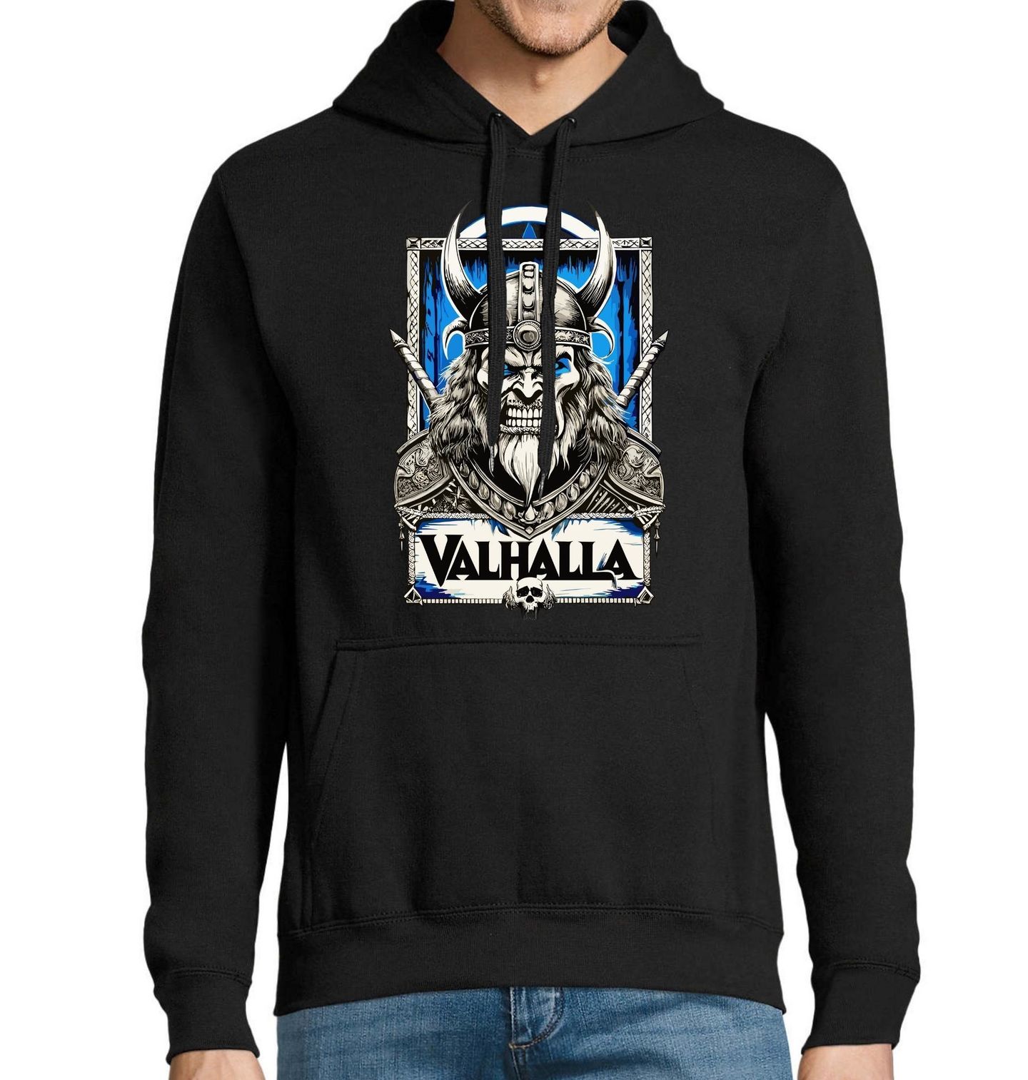 Pánská mikina Hněv Vikingského Válečníka VALHALLA. Viking zde symbolizuje bojovníka, který se nebojí smrti a přijímá ji jako cestu k věčné slávě. Výraz obličeje, lebka a kontrastní modré prvky evokují boj, chlad severu a posmrtný svět padlých hrdinů. Motiv je ideální pro fanoušky severské mytologie, metalu, fantasy a tvrdé nordské estetiky.