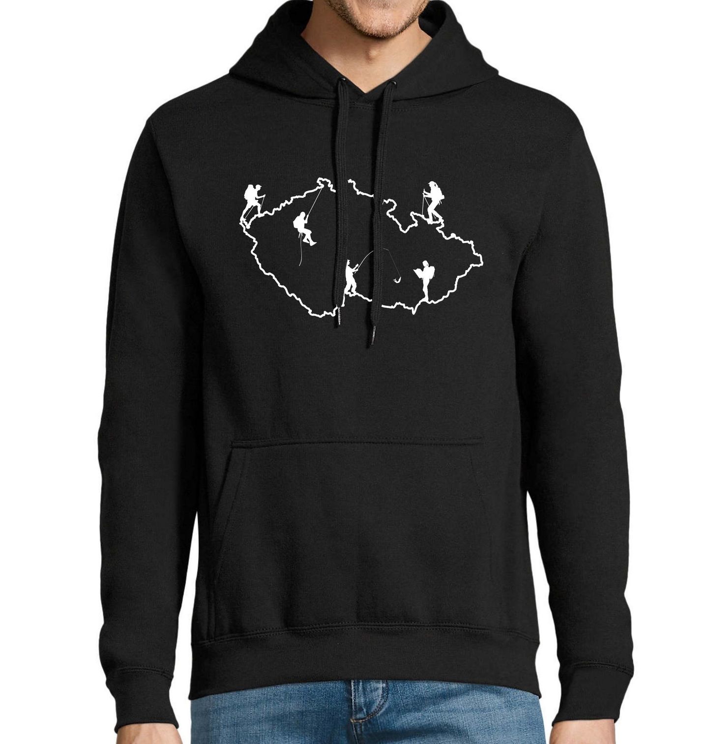 Pánská mikina Hobby mapa Česka. Stylové vyznání všem dobrodruhům, kteří ví, že Česká republika není jen místo na mapě – je to ráj pro horolezce, rybáře, cestovatele a milovníky přírody. Každý kout naší země skrývá nové zážitky a tenhle vtipný design ti připomene, že víkend bez výpravy je promarněný. Ať už šplháš po skalách, čteš mapu nebo nahazuješ prut – Česko tě prostě baví!