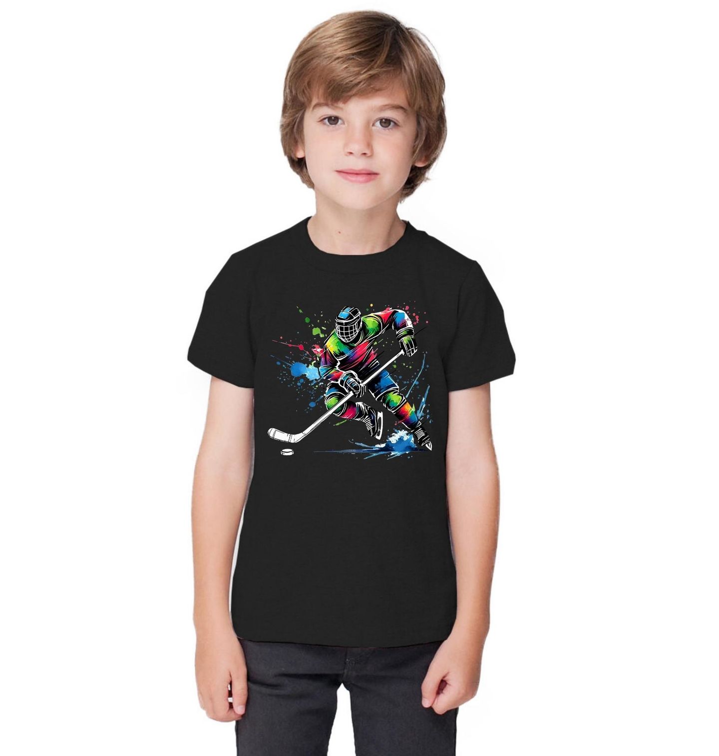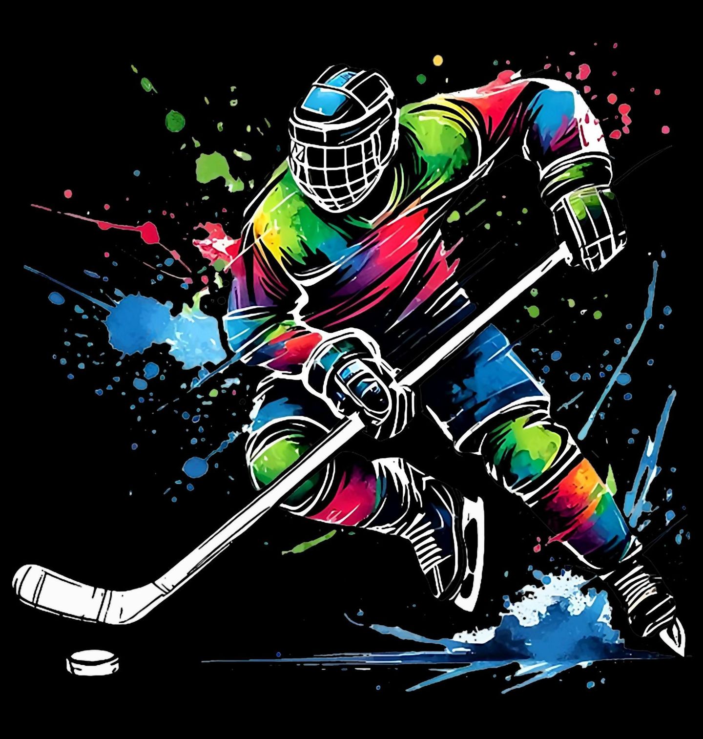Dětské tričko Hokejista Útočí. Tento potisk přináší hokej v naprosto netradičním provedení – jako výbuch barevného umění! Dynamická silueta hokejisty v pohybu doplněná o graffiti a sprejové efekty zaujme každého fanouška sportu. Pokud miluješ hokej a hledáš něco výjimečného, tenhle motiv je přesně pro tebe.