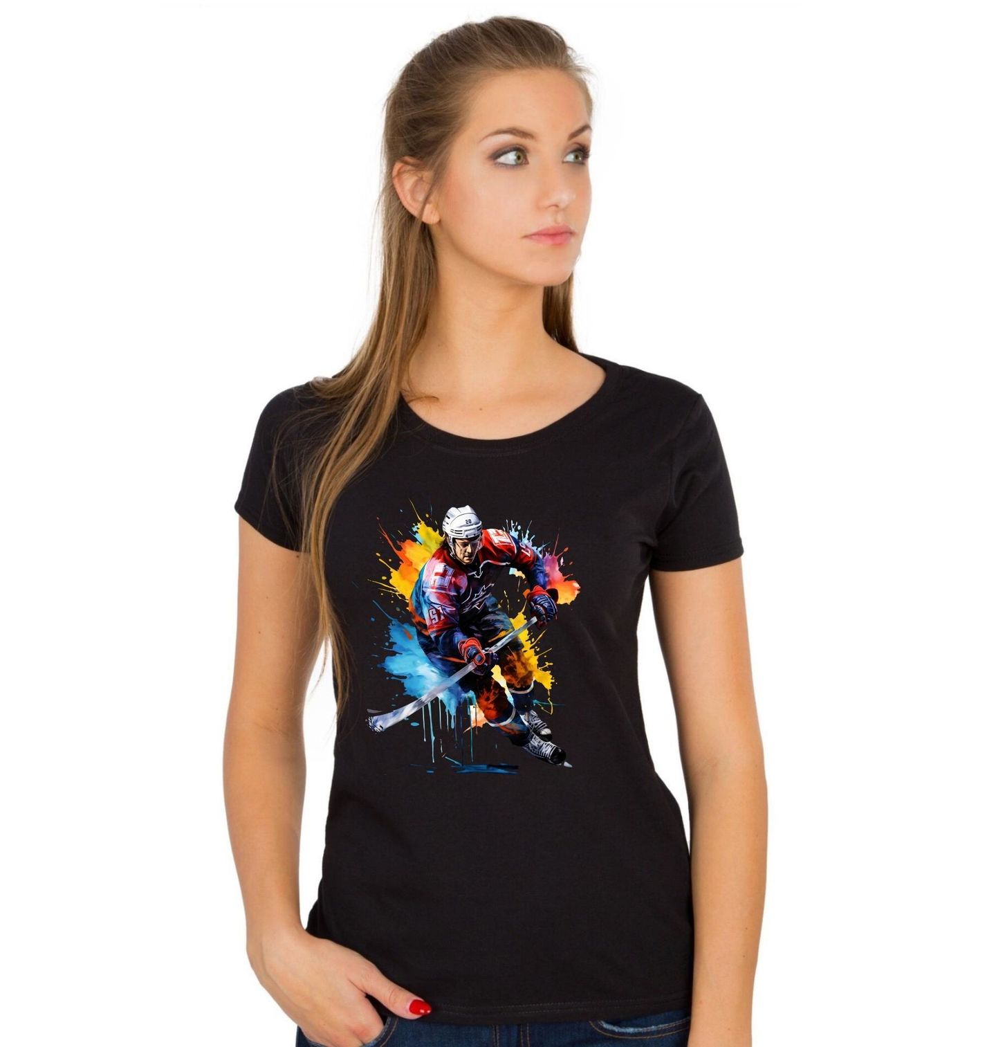 Dámské tričko Hokejista v Barvách Vítězství. Tento motiv zachycuje dynamický okamžik, kdy hokejista míří vpřed v plné rychlosti, obklopený explozí barev a energie. Originální malířský styl dodává designu moderní look a podtrhuje sílu, nasazení a vášeň, kterou hokej přináší. Ideální pro všechny, kteří žijí pro sport a milují ledovou arénu – ať už fandíš, nebo stojíš přímo na ledě.