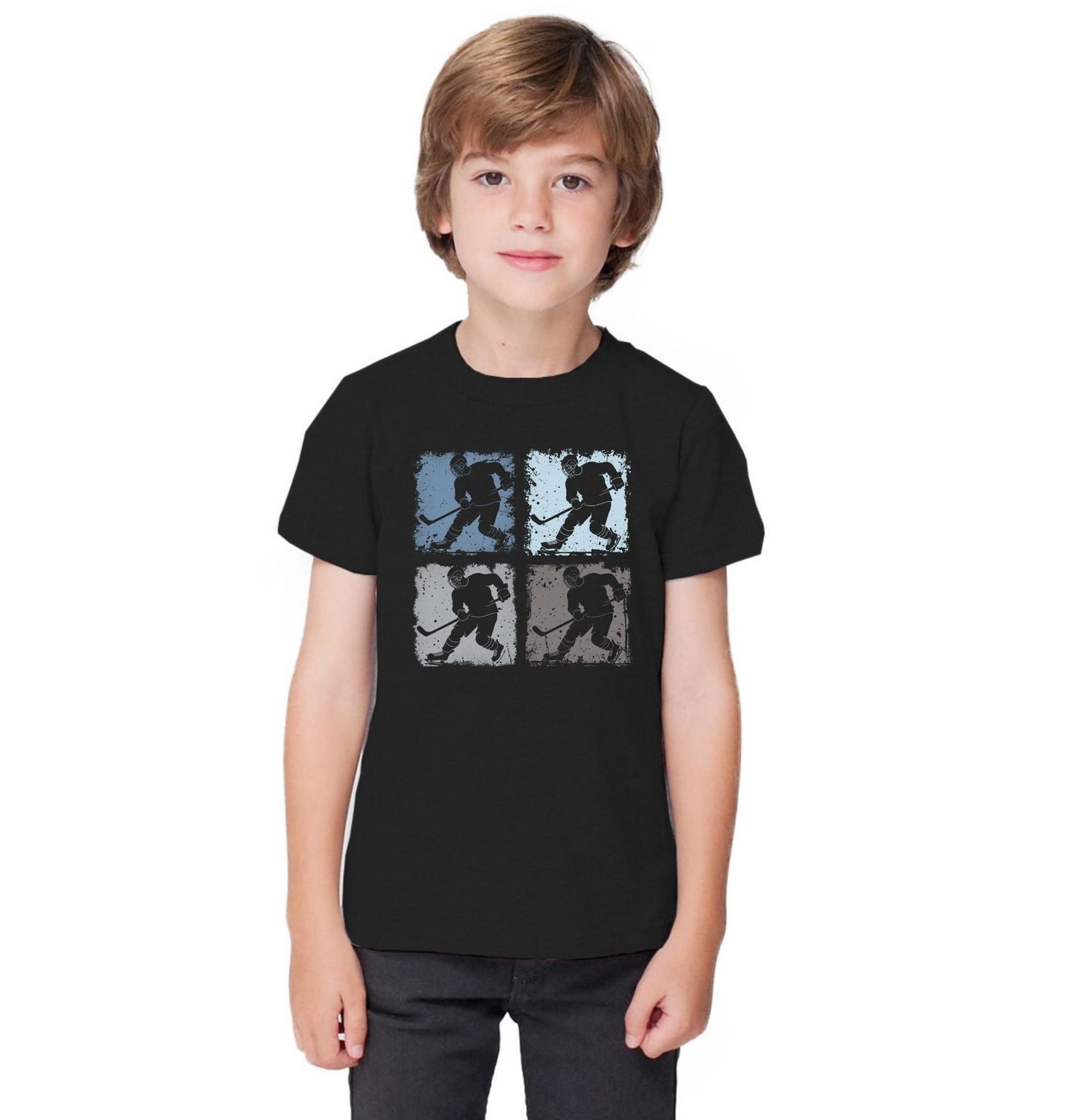 Dětské tričko Hokejisté na Ledě. Tento originální design spojuje sílu a styl – čtyři siluety hokejisty v různých odstínech vytvářejí moderní poctu legendárnímu kolektivnímu sportu. Ať už jsi fanoušek, hráč, nebo prostě miluješ hokej, tenhle motiv tě vtáhne zpět na led.