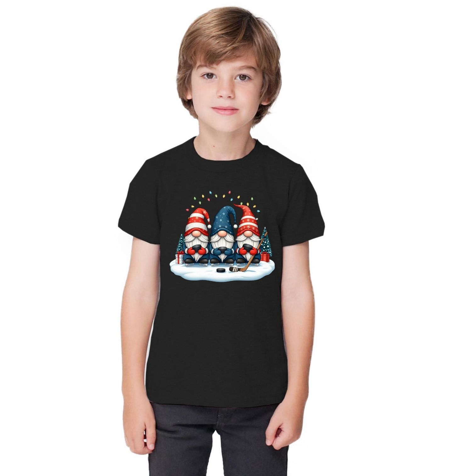 Dětské tričko Hokejoví Vánoční Trpaslíci. Připravte se na svátky s originálním potiskem, který spojuje Vánoce a hokej! Tři vánoční trpaslíci s čepicemi, hokejkami a puky sedí na sněhové ploše připraveni na zimní zápas. Ideální pro fanoušky zimní pohody, sportu a roztomilých motivů.