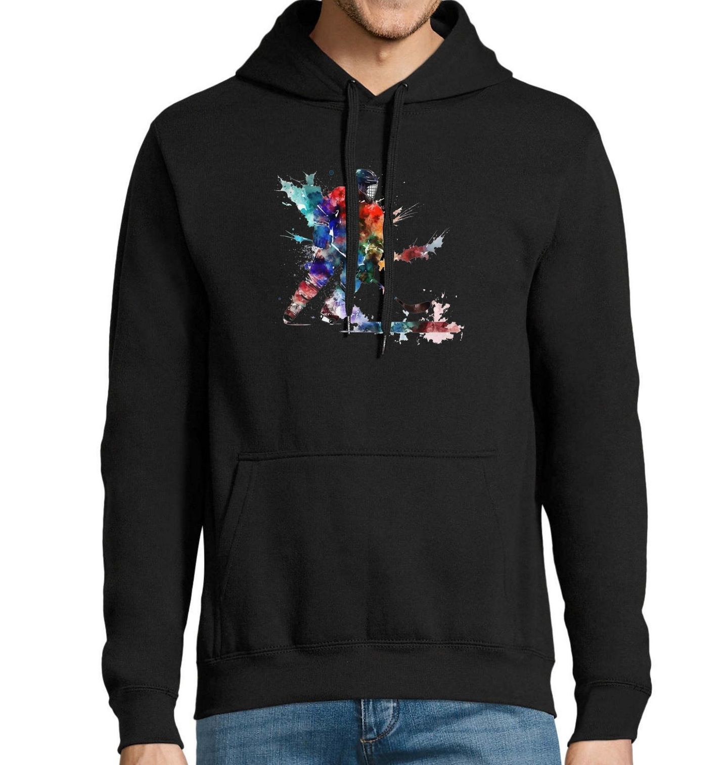 Pánská mikina Hokejový Obránce Watercolor Hockey Player. Hokejista, který v sobě spojuje vášeň pro hokej a jedinečný umělecký styl akvarelu. Tento pestrobarevný hokejista přináší na látku energii zápasu i krásu pohybu na ledě. Perfektní volba pro každého fanouška hokeje, sportovce i milovníka originální grafiky.
