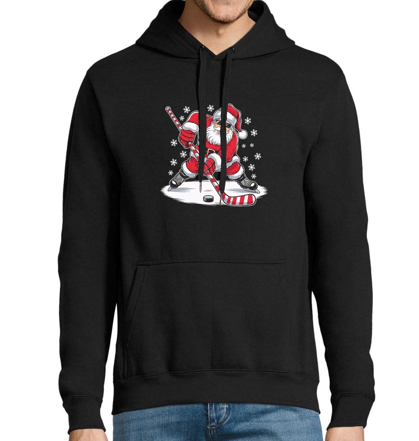 Pánská mikina Hokejový Útočík Santa. Tento motiv zachycuje Santa Clause s hokejkou v ruce a pukem před sebou, připraveného na pořádný útok. Perfektní volba pro každého fanouška zimních sportů, který ví, že hokej a Vánoce jdou skvěle dohromady.