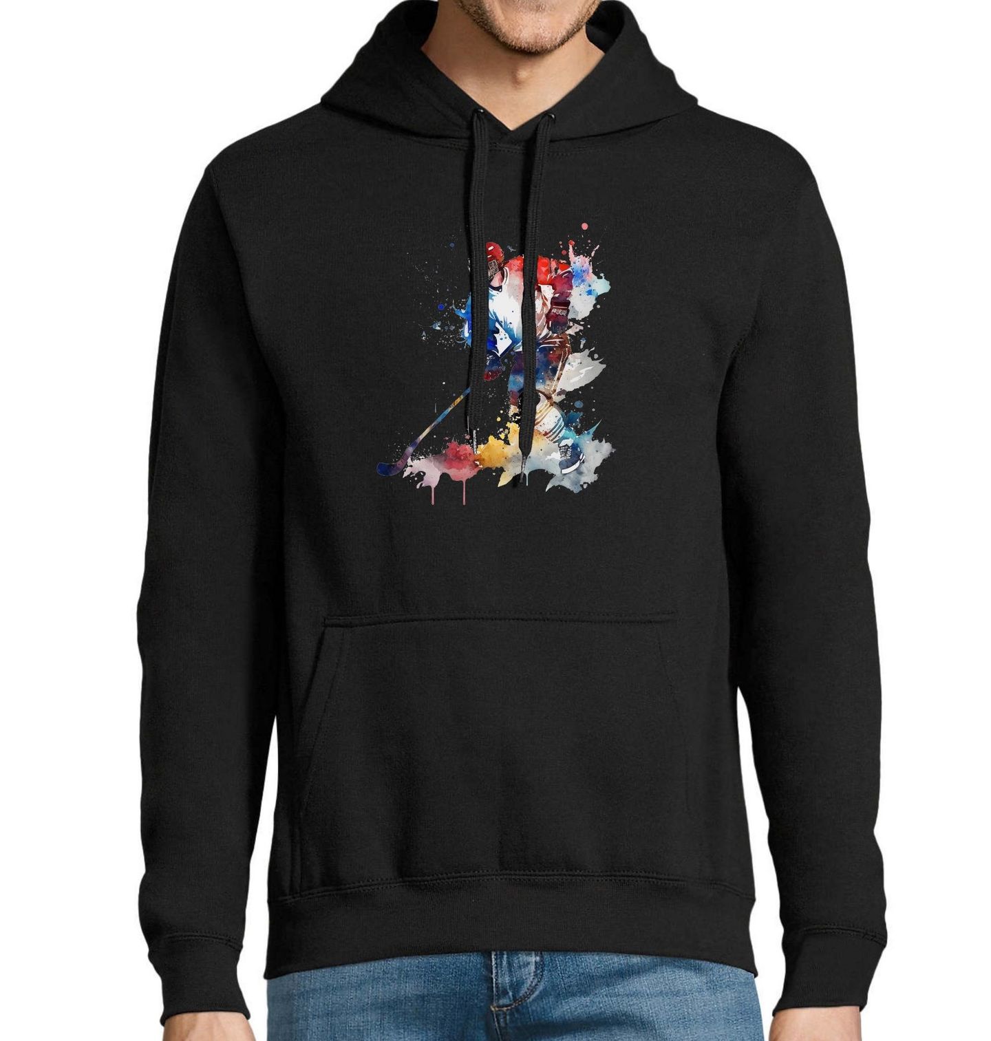 Pánská mikina Hokejový Útočník Watercolor Hockey Player. Hokejista ve stylu akvarelu zachycuje dynamiku a energii hokeje v každém tahu štětce. Barevná explozivní kompozice evokuje vášeň pro led i pohyb, který miluje každý fanoušek. Skvělé pro hráče, fanoušky nebo jako stylový dárek.